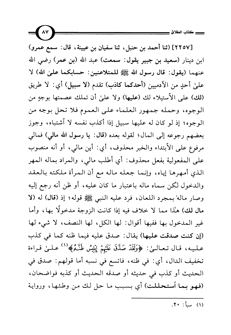 [2257] (ثنا أحمد بن حنبل، ثنا سفيان بن عيينة، قال: سمع عمرو) ابن دينار (سعيد بن جبير يقول: سمعت) عبد الله (بن عمر) رضي الله عنهما (يقول: قال رسول الله - صلى الله عليه وسلم - للمتلاعنين: حسابكما على الله) لا على أحدٍ من الآدميين (أحدكما كاذب) تقدم (لا سبيل) أي: لا طريق (لك) على الاستيلاء لك (عليها) ولا على أن تملك عصمتها بوجهٍ من الوجوه، وحمله جمهور العلماء على العموم فلا تحل بوجه من الوجوه؛ إذ لو كان له عليها سبيل إذا أكذب نفسه لا اشتباه، وجوز بعضهم رجوعه إلى المال؛ لقوله بعده (قال: يا رسول الله مالي) فمالي مرفوع على الابتداء والخبر محذوف، أي: أين مالي، أو أنه منصوب على المفعولية بفعل محذوف: أي أطلب مالي، والمراد بماله المهر الذي أمهرها إياه، وإنما جعله ماله مع أن المرأة ملكته بالعقد والدخول لكن سماه ماله باعتبار ما كان عليه، أو ظن أنه رجع إليه وصار ماله بمجرد اللعان، فرد عليه النبي - صلى الله عليه وسلم - قوله؛ إذ (قال) له (لا مال لك) هذا مما لا خلاف فيه إذا كانت الزوجة مدخولًا بها، وأما غير المدخول بها ففيها أقوال: لها الكل، لها النصف، لا شيء لها (إن كنت صدقت عليها) يقال: صدق عليه فيما ظنه كما في كذب عليه، قال تعالى: {وَلَقَدْ صَدَّقَ عَلَيْهِمْ إِبْلِيسُ ظَنَّهُ} (¬1) على قراءة تخفيف الدال، أي: في ظنه، فاتسع في نسبه أما قولهم: صدق في الحديث أو كذب في حديثه أو صدقه الحديث أو كذبه فواضحان، (فهو بما استحللت) أي بسبب ما حل لك من وطئها، ورواية