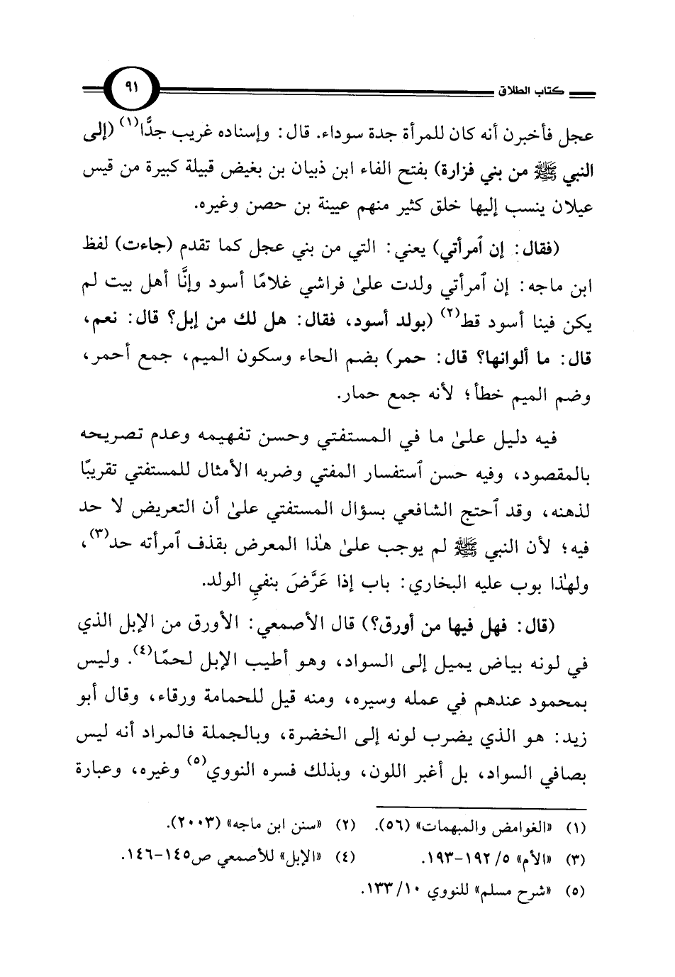 (فقال: إن امرأتي) يعني: التي من بني عجل كما تقدم (جاءت) لفظ ابن ماجه: إن امرأتي ولدت على فراشي غلامًا أسود وإنَّا أهل بيت لم يكن فينا أسود قط (¬2) (بولد أسود، فقال: هل لك من إبل؟ قال: نعم، قال: ما ألوانها؟ قال: حمر) بضم الحاء وسكون الميم، جمع أحمر، وضم الميم خطأ؛ لأنه جمع حمار.