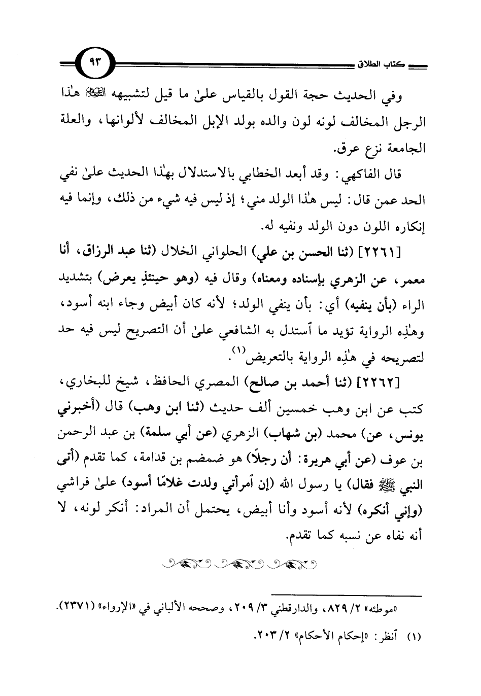 [2261] (ثنا الحسن بن علي) الحلواني الخلال (ثنا عبد الرزاق، أنا معمر، عن الزهري بإسناده ومعناه) وقال فيه (وهو حينئذٍ يعرض) بتشديد الراء (بأن ينفيه) أي: بأن ينفي الولد؛ لأنه كان أبيض وجاء ابنه أسود، وهذِه الرواية تؤيد ما استدل به الشافعي على أن التصريح ليس فيه حد لتصريحه في هذِه الرواية بالتعريض (¬1).
