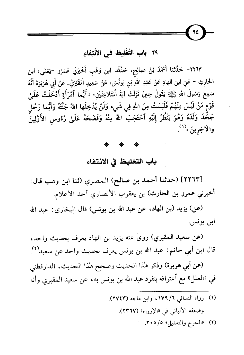 [2263] (حدثنا أحمد بن صالح) المصري (ثنا ابن وهب قال: أخبرني عمرو بن الحارث) بن يعقوب الأنصاري أحد الأعلام.