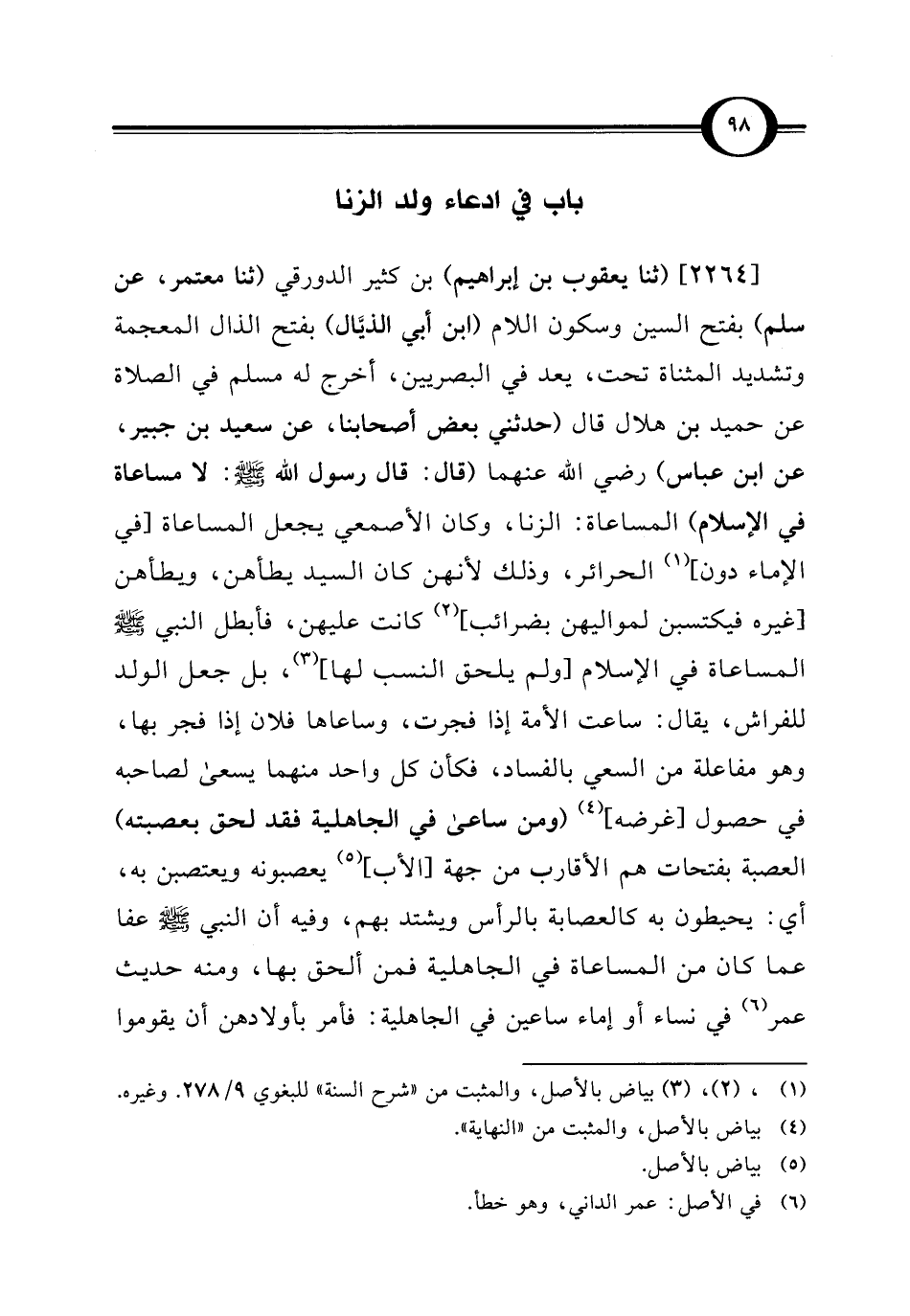 [2264] (ثنا يعقوب بن إبراهيم) بن كثير الدورقي (ثنا معتمر، عن سلم) بفتح السين وسكون اللام (ابن أبي الذيَّال) بفتح الذال المعجمة وتشديد المثناة تحت، يعد في البصريين، أخرج له مسلم في الصلاة عن حميد بن هلال قال (حدثني بعض أصحابنا، عن سعيد بن جبير، عن ابن عباس) رضي الله عنهما (قال: قال رسول الله - صلى الله عليه وسلم -: لا مساعاة في الإسلام) المساعاة: الزنا، وكان الأصمعي يجعل المساعاة [في الإماء دون] (¬1) الحرائر، وذلك لأنهن كان السيد يطأهن، ويطأهن [غيره فيكتسبن لمواليهن بضرائب] (¬2) كانت عليهن، فأبطل النبي - صلى الله عليه وسلم - المساعاة في الإسلام [ولم يلحق النسب لها] (¬3)، بل جعل الولد للفراش، يقال: ساعت الأمة إذا فجرت، وساعاها فلان إذا فجر بها، وهو مفاعلة من السعي بالفساد، فكأن كل واحد منهما يسعى لصاحبه في حصول [غرضه] (¬4) (ومن ساعى في الجاهلية فقد لحق بعصبته) العصبة بفتحات هم الأقارب من جهة [الأب] (¬5) يعصبونه ويعتصبن به، أي: يحيطون به كالعصابة بالرأس ويشتد بهم، وفيه أن النبي - صلى الله عليه وسلم - عفا عما كان من المساعاة في الجاهلية فمن ألحق بها، ومنه حديث عمر (¬6) في نساء أو إماء ساعين في الجاهلية: فأمر بأولادهن أن يقوموا