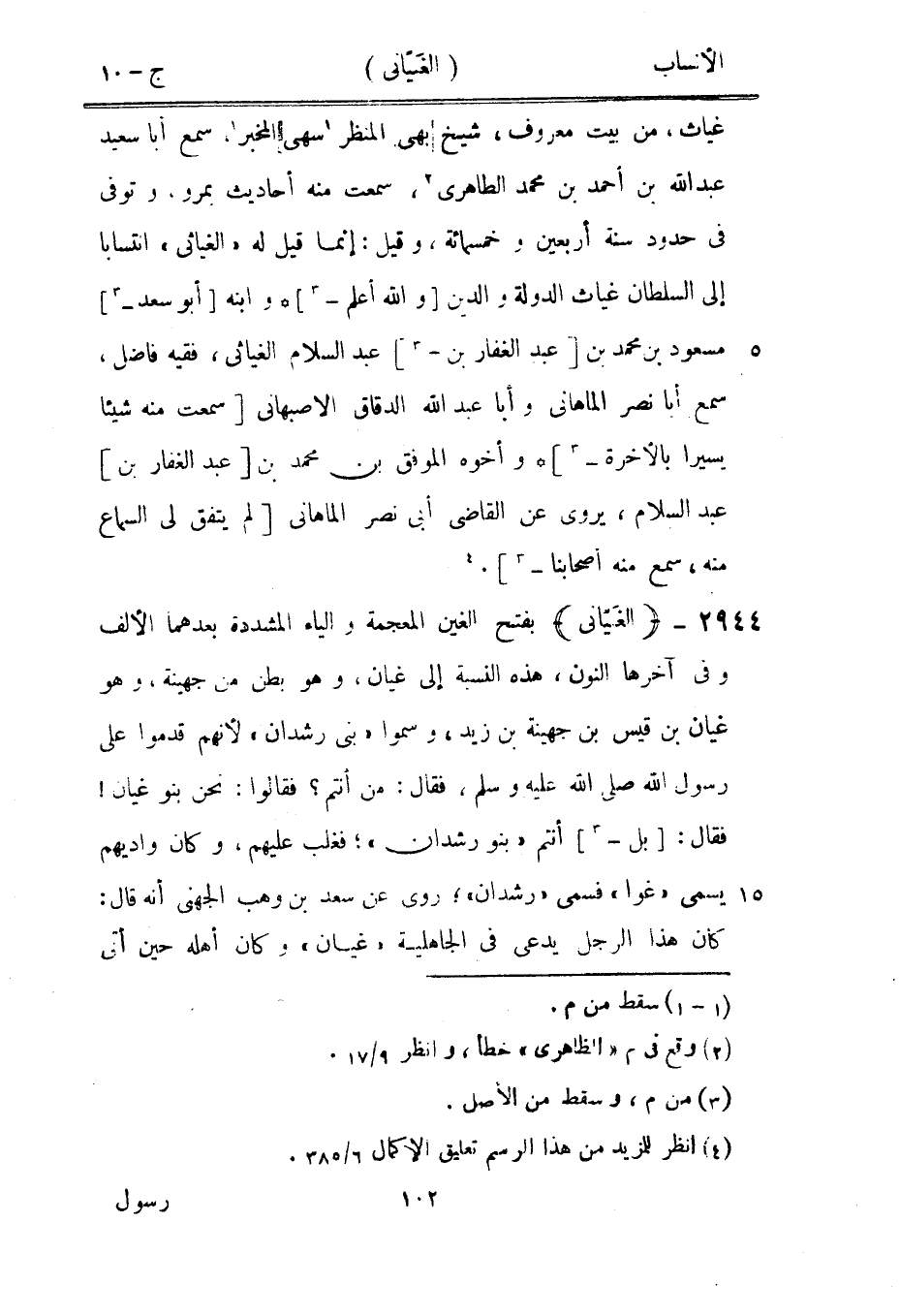 بفتح الغين المعجمة والياء المشددة بعدهما الألف وفي آخرها النون، هذه النسبة إلى غيان، وهو بطن من جهينة، وهو غيان بن قيس بن جهينة بن زيد، وسموا «بنى رشدان» لأنهم قدموا على رسول الله صلى الله عليه وسلم، فقال: من أنتم؟ فقالوا: نحن بنو غيان! فقال: [بل-[3]] أنتم «بنو رشدان» ، فغلب عليهم، وكان واديهم يسمى «غوا» فسمى «رشدان» ، روى عن سعد بن وهب الجهنيّ أنه قال: كان هذا الرجل يدعى في الجاهلية «غيان» وكان أهله حين أتى