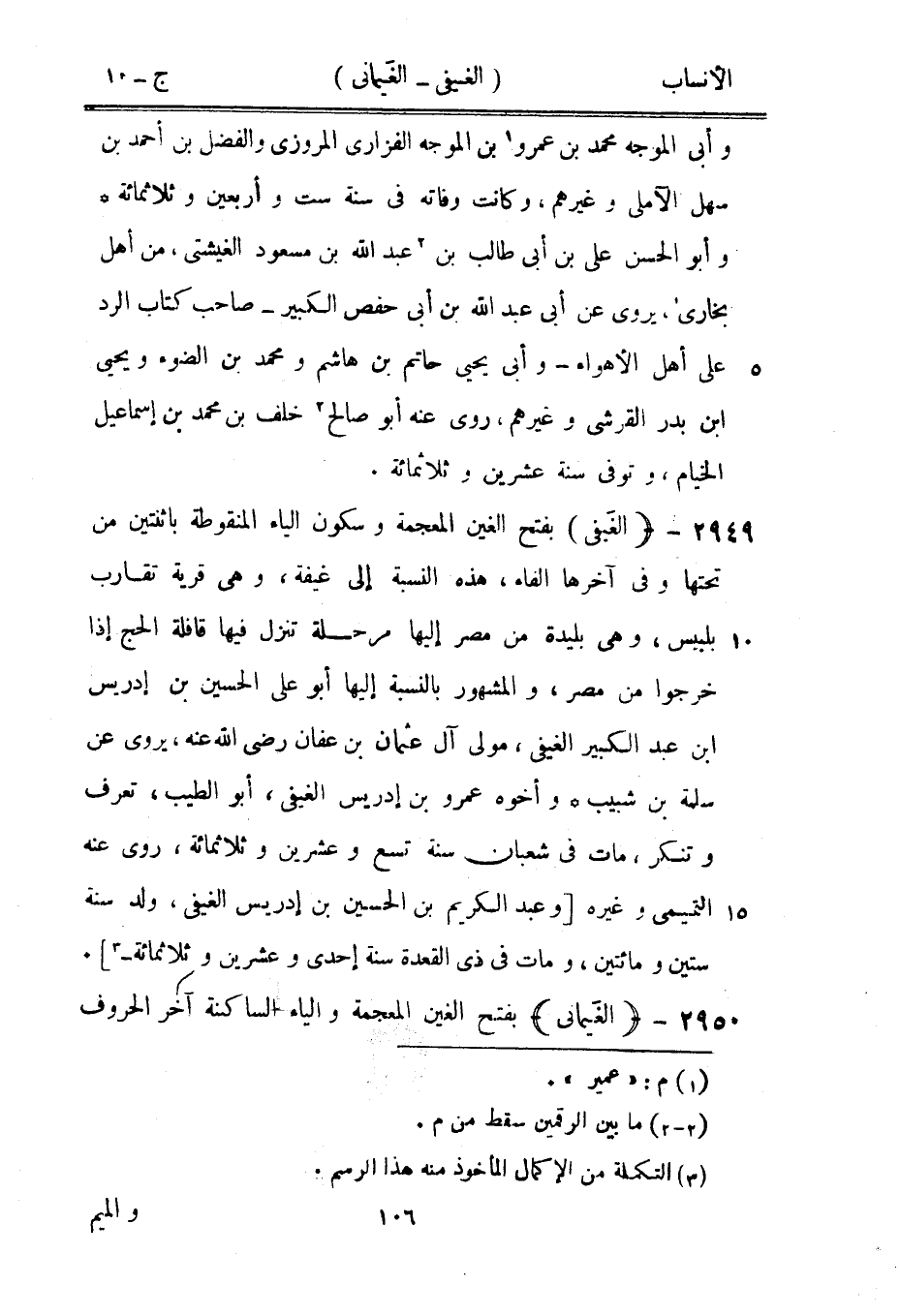بفتح الغين المعجمة وسكون الياء المنقوطة باثنتين من تحتها وفي آخرها الفاء، هذه النسبة إلى غيفة، وهي قرية تقارب بلبيس، وهي بليدة من مصر إليها مرحلة تنزل فيها قافلة الحج إذا خرجوا من مصر، والمشهور بالنسبة إليها أبو على الحسين بن إدريس ابن عبد الكبير الغيفى، مولى آل عثمان بن عفان رضى الله عنه، يروى عن سلمة بن شبيب وأخوه عمرو بن إدريس الغيفى، أبو الطيب، تعرف وتنكر، مات في شعبان سنة تسع وعشرين وثلاثمائة، روى عنه التميمي وغيره [وعبد الكريم بن الحسين بن إدريس الغيفى، ولد سنة ستين ومائتين، ومات في ذي القعدة سنة إحدى وعشرين وثلاثمائة-[3]] .