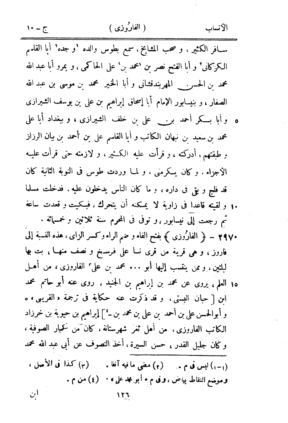 بفتح الفاء وضم الراء وكسر الزاى، هذه النسبة إلى فاروز، وهي قرية من قرى نسا على فرسخ ونصف منها، بت بها ليلتين، وممن ينتسب إليها أبو ... محمد بن على [3] الفاروزى، من أهل العلم، يروى عن محمد بن إبراهيم بن الجنيد، روى عنه أبو حاتم محمد ابن [حبان البستي، وقد ذكرت عنه حكاية في ترجمة «القريبى» وأبو الحسن على بن أحمد بن على بن محمد بن-[4]] إبراهيم بن حيويه بن خرزاد الكاتب الفاروزى، من أهل ثغر شهرستانة، كان من كبار الصوفية، وكان جليل القدر، حسن السيرة، أخذ التصوف عن أبى عبد الله محمد