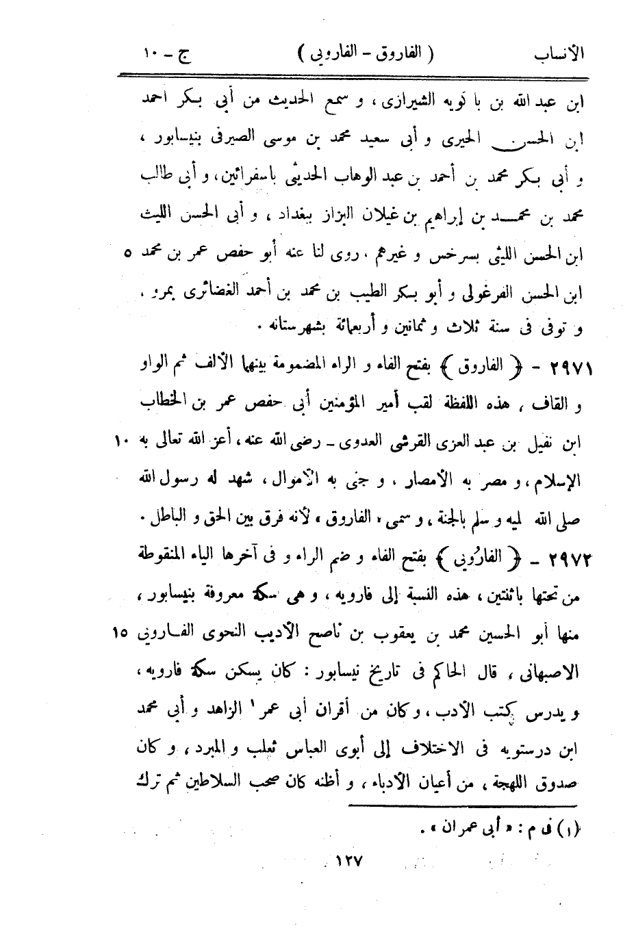 بفتح الفاء وضم الراء وفي آخرها الياء المنقوطة من تحتها باثنتين، هذه النسبة إلى فارويه، وهي سكة معروفة بنيسابور، منها أبو الحسين محمد بن يعقوب بن ناصح الأديب النحويّ الفارويى الأصبهاني، قال الحاكم في تاريخ نيسابور: كان يسكن سكة فارويه، ويدرس كتب الأدب، وكان من أقران أبى عمر [1] الزاهد وأبى محمد ابن درستويه في الاختلاف إلى أبوي العباس ثعلب والمبرد، وكان صدوق اللهجة، من أعيان الأدباء، وأظنه كان صحب السلاطين ثم ترك