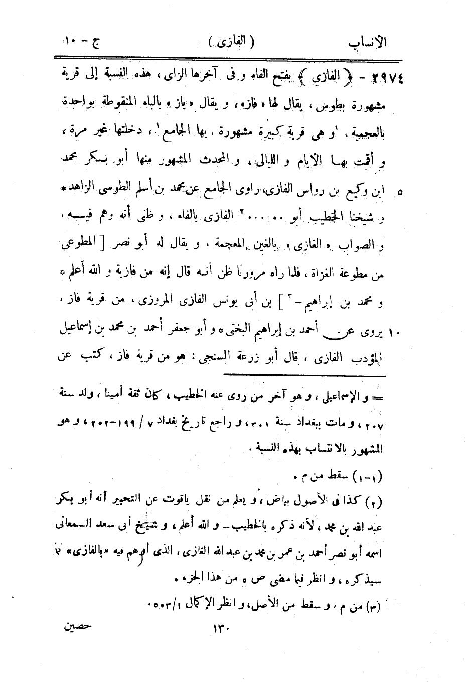 بفتح الفاء وفي آخرها الزاى، هذه النسبة إلى قرية مشهورة بطوس، يقال لها «فاز» ، ويقال «باز» بالباء المنقوطة بواحدة بالعجمية، [1] وهي قرية كبيرة مشهورة، بها الجامع [1] ، دخلتها غير مرة، وأقمت بها الأيام والليالي، والمحدث المشهور منها أبو بكر محمد ابن وكيع بن رواس الفازى، راوي الجامع عن محمد بن أسلم الطوسي الزاهد وشيخنا الخطيب أبو.... [2] الفازى بالفاء، وظني أنه وهم فيه، والصواب «الغازي» بالغين المعجمة، ويقال له أبو نصر [المطوعي من مطوعة الغزاة، فلما رآه مرورنا ظن أنه قال إنه من فازية والله أعلم ومحمد بن إبراهيم-[3]] بن أبى يونس الفازى المروزي، من قرية فاز، يروى عن أحمد بن إبراهيم البختي وأبو جعفر أحمد بن محمد بن إسماعيل المؤدب الفازى، قال أبو زرعة السنجى: هو من قرية فاز، كتب عن