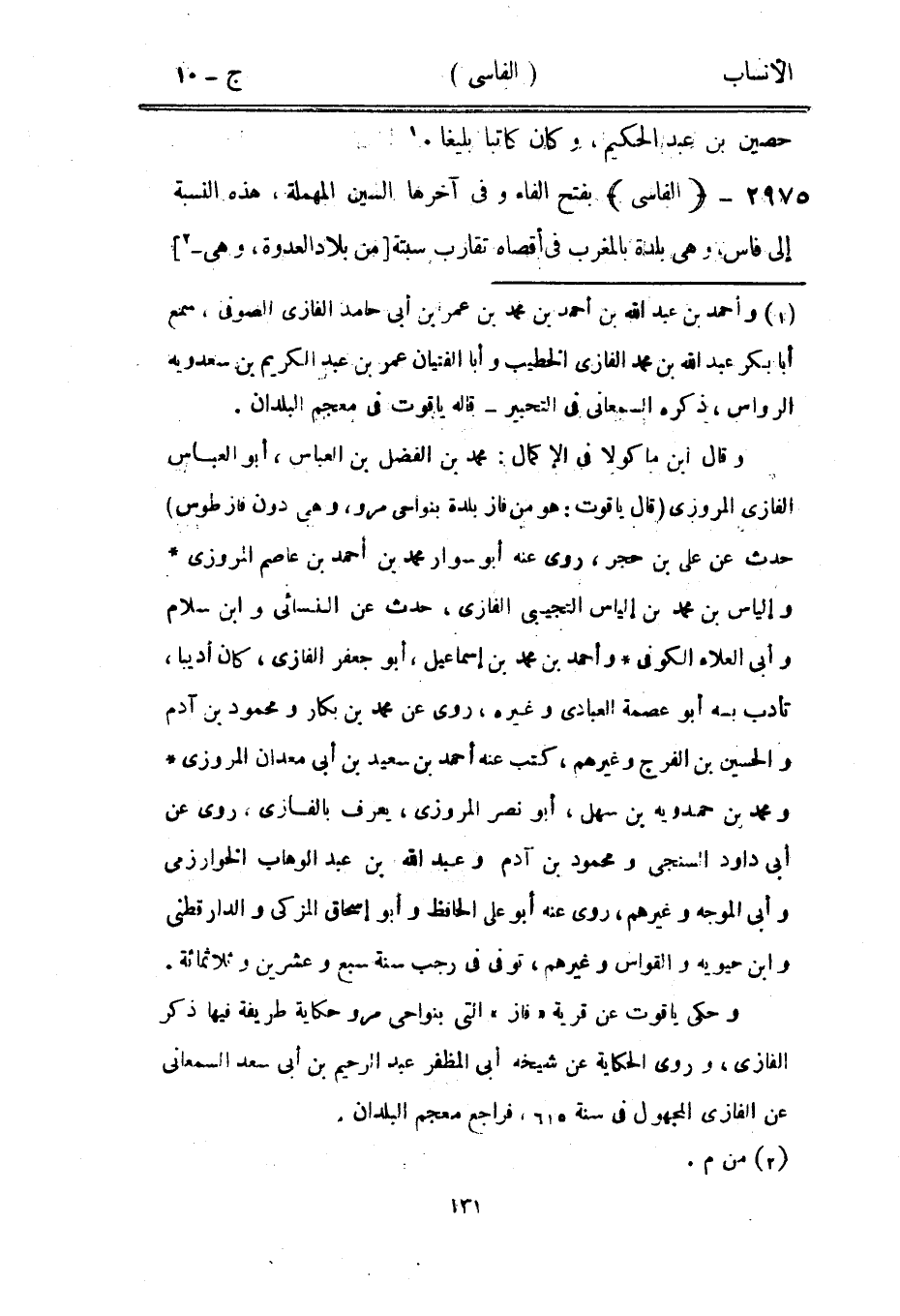 وقال ابن ماكولا في الإكمال: محمد بن الفضل بن العباس، أبو العباس الفازى المروزي (قال ياقوت: هو من فاز بلدة بنواحي مرو، وهي دون فاز طوس) حدث عن على بن حجر، روى عنه أبو سوار محمد بن أحمد بن عاصم المروزي وإلياس بن محمد بن إلياس التجيبي الفازى، حدث عن النسائي وابن سلام وأبى العلاء الكوفي وأحمد بن محمد بن إسماعيل، أبو جعفر الفازى، كان أديبا، تأدب به أبو عصمة العبادي وغيره، روى عن محمد بن بكار ومحمود بن آدم والحسين بن الفرج وغيرهم، كتب عنه أحمد بن سعيد بن أبى معدان المروزي ومحمد بن حمدويه بن سهل، أبو نصر المروزي، يعرف بالفازى، روى عن أبى داود السنجى ومحمود بن آدم وعبد الله بن عبد الوهاب الخوارزمي وأبى الموجه وغيرهم، روى عنه أبو على الحافظ وأبو إسحاق المزكي والدار قطنى وابن حيويه والقواس وغيرهم، توفى في رجب سنة سبع وعشرين وثلاثمائة.