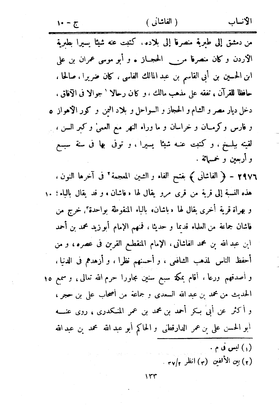 بفتح الفاء والشين المعجمة [2] في آخرها النون، هذه النسبة إلى قرية من قرى مرو يقال لها «فاشان» وقد يقال بالباء، وبهراة قرية أخرى يقال لها «باشان» بالباء المنقوطة بواحدة [3] ، خرج من فاشان جماعة من العلماء قديما وحديثا، فمنهم الإمام أبو زيد محمد بن أحمد ابن عبد الله بن محمد الفاشانى، الإمام المنقطع القرين في عصره، ومن أحفظ الناس لمذهب الشافعيّ، وأحسنهم نظرا، وأزهدهم في الدنيا، وأصدقهم ورعا، أقام بمكة سبع سنين مجاورا حرم الله تعالى، وسمع الحديث من محمد بن عبد الله السعدي وجماعة من أصحاب على بن حجر، وأكثر عن أبى بكر أحمد بن محمد بن عمر المنكدرى، روى عنه أبو الحسن على بن عمر الدار قطنى والحاكم أبو عبد الله محمد بن عبد الله