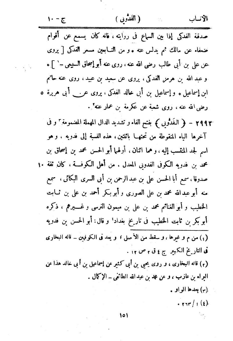 بفتح الفاء وتشديد الدال المهملة المضمومة [3] وفي آخرها الياء المنقوطة من تحتها باثنتين، هذه النسبة إلى فدويه، وهو اسم لجد المنتسب إليه، وهما اثنان، أولهما أبو الحسن محمد بن إسحاق بن محمد بن فدويه الكوفي الفدويى المعدل، من أهل الكوفة، كان ثقة صدوقا، سمع أبا الحسن على بن عبد الرحمن بن أبى السري البكائي، سمع منه أبو عبد الله محمد بن على الصوري وأبو بكر أحمد بن على بن ثابت الخطيب وأبو الغنائم محمد بن على بن ميمون النرسي وغيرهم، ذكره أبو بكر بن ثابت الخطيب في تاريخ بغداد [4] وقال: أبو الحسن بن فدويه