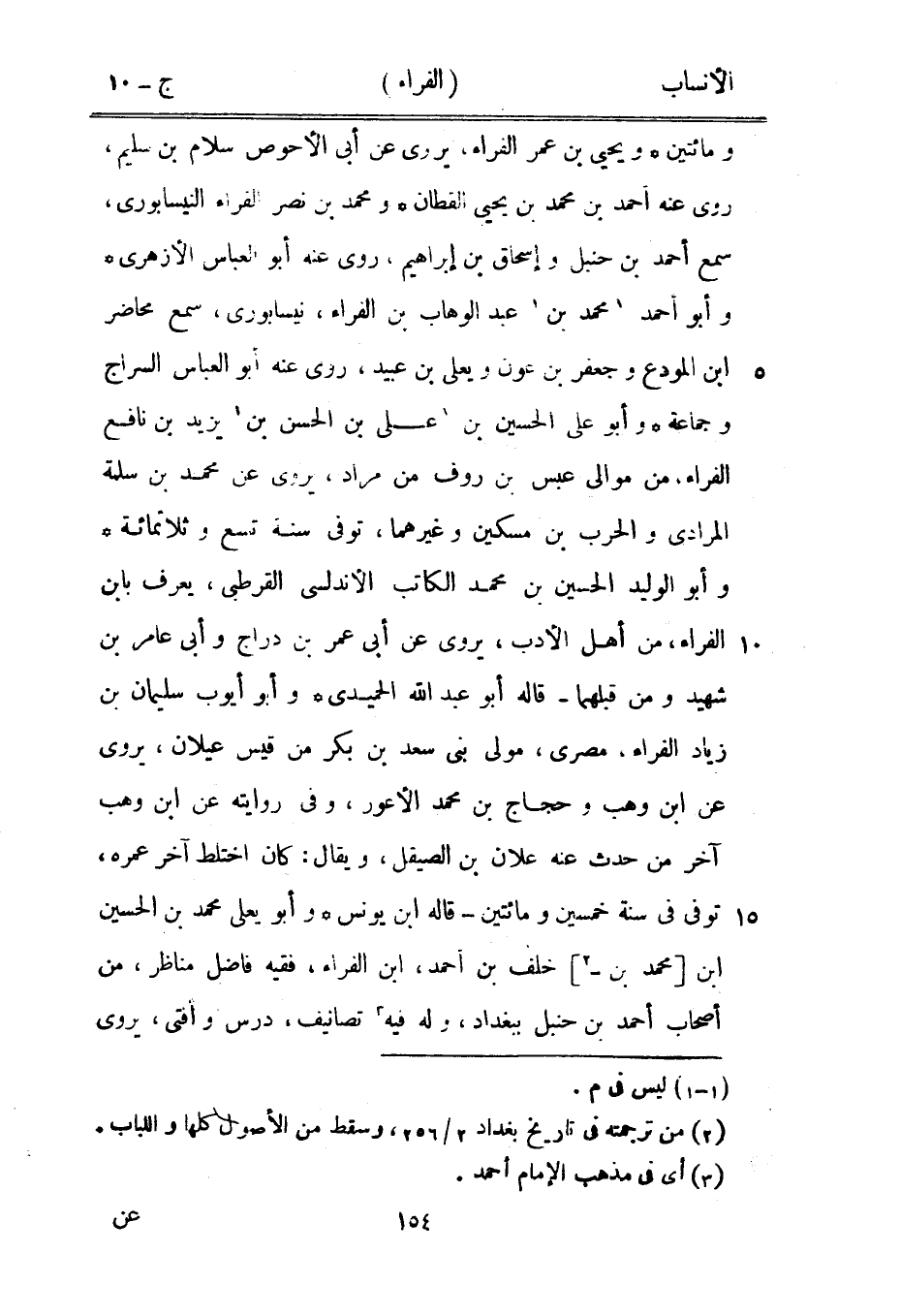 ومائتين ويحيى بن عمر الفراء، يروى عن أبى الأحوص سلام بن سليم، روى عنه أحمد بن محمد بن يحيى القطان ومحمد بن نصر الفراء النيسابورىّ، سمع أحمد بن حنبل وإسحاق بن إبراهيم، روى عنه أبو العباس الأزهري وأبو أحمد [1] محمد بن [1] عبد الوهاب بن الفراء، نيسابوري، سمع محاضر ابن المودع وجعفر بن عون ويعلى بن عبيد، روى عنه أبو العباس السراج وجماعة وأبو على الحسين بن [1] على بن الحسن بن [1] يزيد بن نافع الفراء، من موالي عبس بن روف من مراد، يروى عن محمد بن سلمة المرادي والحرب بن مسكين وغيرهما، توفى سنة تسع وثلاثمائة وأبو الوليد الحسين بن محمد الكاتب الأندلسى القرطبي، يعرف بابن الفراء، من أهل الأدب، يروى عن أبى عمر بن دراج وأبى عامر بن شهيد ومن قبلهما- قاله أبو عبد الله الحميدي وأبو أيوب سليمان بن زياد الفراء، مصرى، مولى بنى سعد بن بكر من قيس عيلان، يروى عن ابن وهب وحجاج بن محمد الأعور، وفي روايته عن ابن وهب آخر من حدث عنه علان بن الصيقل، ويقال: كان اختلط آخر عمره، توفى في سنة خمسين ومائتين- قاله ابن يونس وأبو يعلى محمد بن الحسين ابن [محمد بن-[2]] خلف بن أحمد، ابن الفراء، فقيه فاضل مناظر، من أصحاب أحمد بن حنبل ببغداد، وله فيه [3] تصانيف، درس وأفتى، يروى