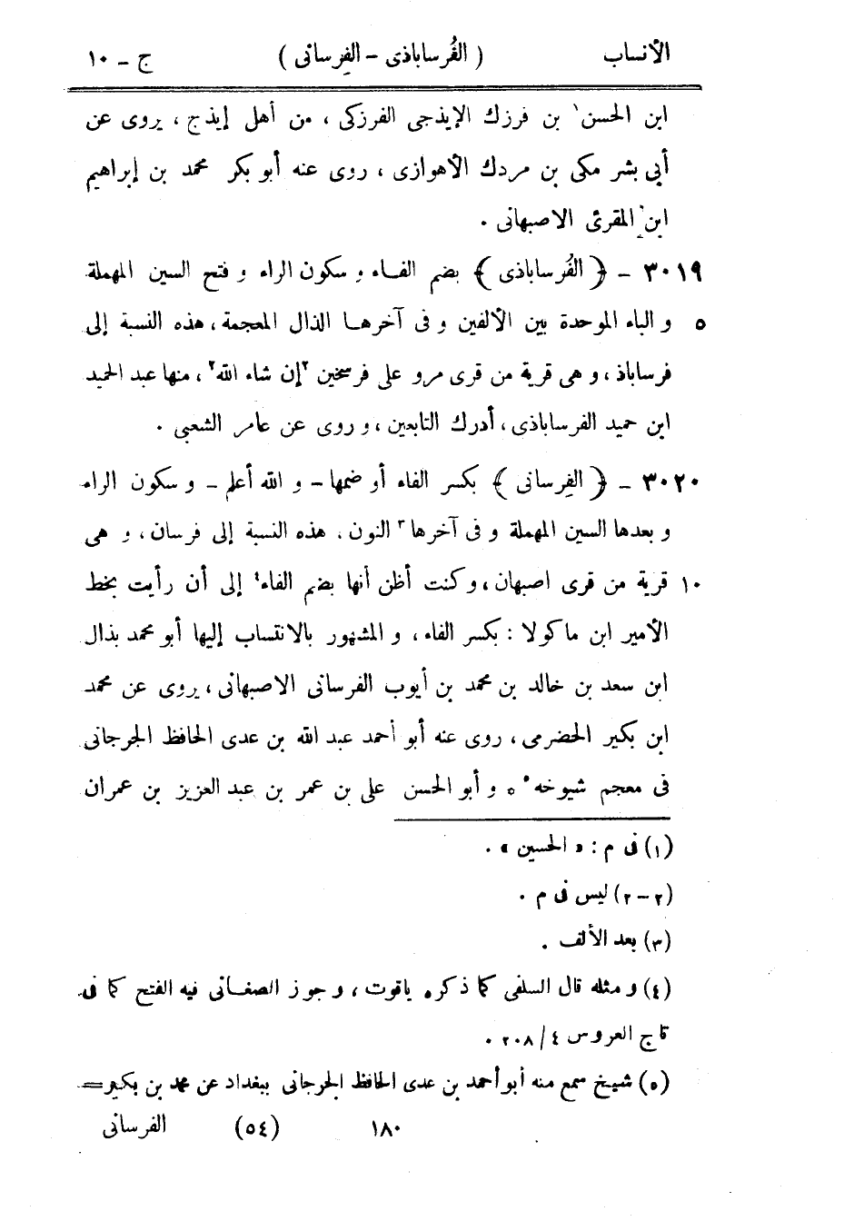 بكسر الفاء أو ضمها- والله أعلم- وسكون الراء وبعدها السين المهملة وفي آخرها [3] النون، هذه النسبة إلى فرسان، وهي قرية من قرى أصبهان، وكنت أظن أنها بضم الفاء [4] إلى أن رأيت بخط الأمير ابن ماكولا: بكسر الفاء، والمشهور بالانتساب إليها أبو محمد بذال ابن سعد بن خالد بن محمد بن أيوب الفرسانى الأصبهاني، يروى عن محمد ابن بكير الحضرميّ، روى عنه أبو أحمد عبد الله بن عدي الحافظ الجرجاني في معجم شيوخه [5] وأبو الحسن على بن عمر بن عبد العزيز بن عمران