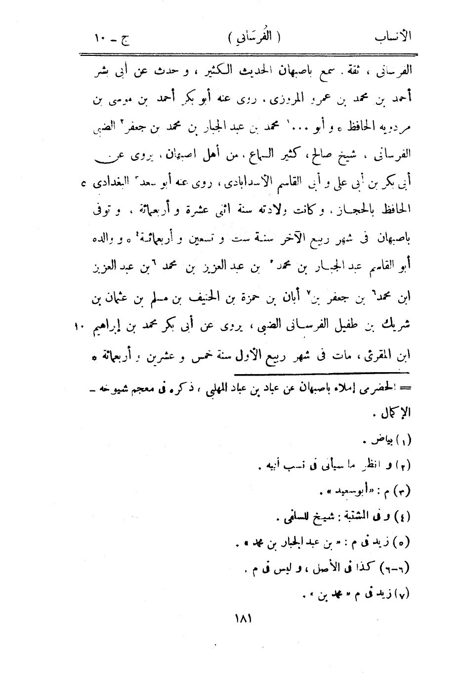 الفرسانى، ثقة، سمع بأصبهان الحديث الكثير، وحدث عن أبى بشر أحمد بن محمد بن عمرو المروزي، روى عنه أبو بكر أحمد بن موسى بن مردويه الحافظ وأبو ... [1] محمد بن عبد الجبار بن محمد بن جعفر [2] الضبيّ الفرسانى، شيخ صالح، كثير السماع، من أهل أصبهان، يروى عن أبى بكر بن أبى على وأبى القاسم الأسدابادي، روى عنه أبو سعد [3] البغدادي الحافظ بالحجاز، وكانت ولادته سنة اثنى عشرة وأربعمائة، وتوفى بأصبهان في شهر ربيع الآخر سنة ست وتسعين وأربعمائة [4] ووالده أبو القاسم عبد الجبار بن محمد [5] بن عبد العزيز بن محمد [6] بن عبد العزيز ابن محمد [6] بن جعفر بن [7] أبان بن حمزة بن الحنيف بن مسلم بن عثمان بن شريك بن طفيل الفرسانى الضبيّ، يروى عن أبى بكر محمد بن إبراهيم ابن المقرئ، مات في شهر ربيع الأول سنة خمس وعشرين وأربعمائة