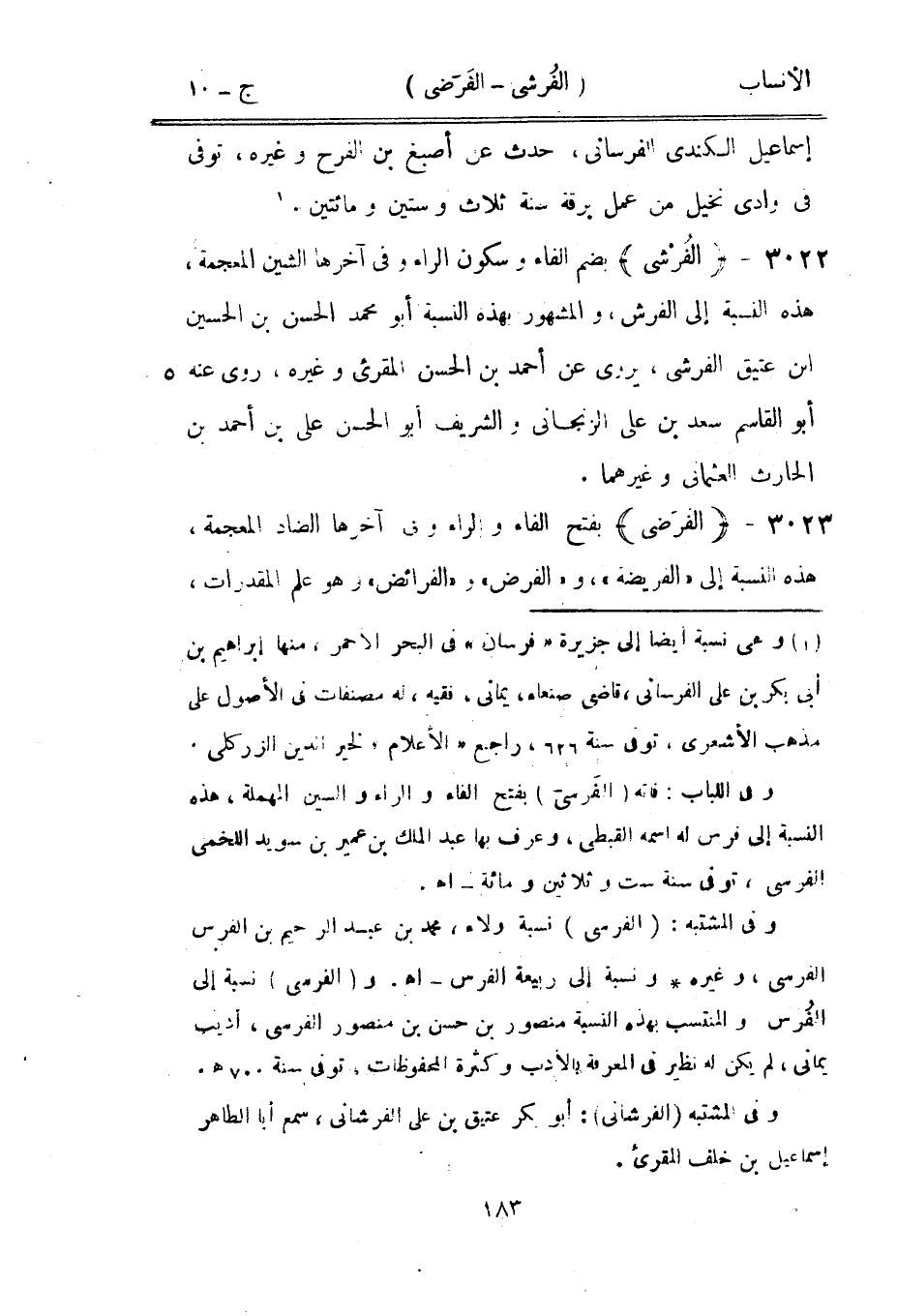 بضم الفاء وسكون الراء وفي آخرها الشين المعجمة، هذه النسبة إلى الفرش، والمشهور بهذه النسبة أبو محمد الحسن بن الحسين ابن عتيق الفرشى، يروى عن أحمد بن الحسن المقرئ وغيره، روى عنه أبو القاسم سعد بن على الزنجاني والشريف أبو الحسن على بن أحمد بن الحارث العثماني وغيرهما.