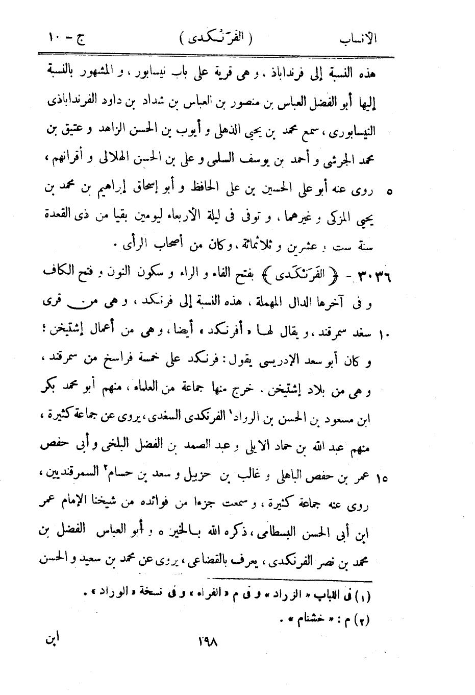 بفتح الفاء والراء وسكون النون وفتح الكاف وفي آخرها الدال المهملة، هذه النسبة إلى فرنكد، وهي من قرى سغد سمرقند، ويقال لها «أفرنكد» أيضا، وهي من أعمال إشتيخن، وكان أبو سعد الإدريسي يقول: فرنكد على خمسة فراسخ من سمرقند، وهي من بلاد إشتيخن، خرج منها جماعة من العلماء، منهم أبو محمد بكر ابن مسعود بن الحسن بن الرواد [1] الفرنكدى السغدى، يروى عن جماعة كثيرة، منهم عبد الله بن حماد الأيلي وعبد الصمد بن الفضل البلخي وأبى حفص عمر بن حفص الباهلي وغالب بن حزبيل وسعد بن حسام [2] السمرقنديين، روى عنه جماعة كثيرة، وسمعت جزءا من فوائده من شيخنا الإمام عمر ابن أبى الحسن البسطامي، ذكره الله بالخير وأبو العباس الفضل بن محمد بن نصر الفرنكدى، يعرف بالقضاعي، يروى عن محمد بن سعيد والحسن