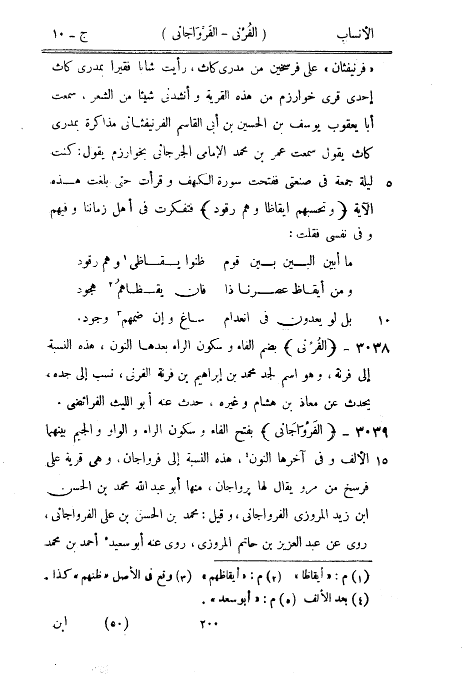 بفتح الفاء وسكون الراء والواو والجيم بينهما الألف وفي آخرها النون [4] ، هذه النسبة إلى فرواجان، وهي قرية على فرسخ من مرو يقال لها پرواجان، منها أبو عبد الله محمد بن الحسن ابن زيد المروزي الفرواجانى، وقيل: محمد بن الحسن بن على الفرواجانى، روى عن عبد العزيز بن حاتم المروزي، روى عنه أبو سعيد [5] أحمد بن محمد