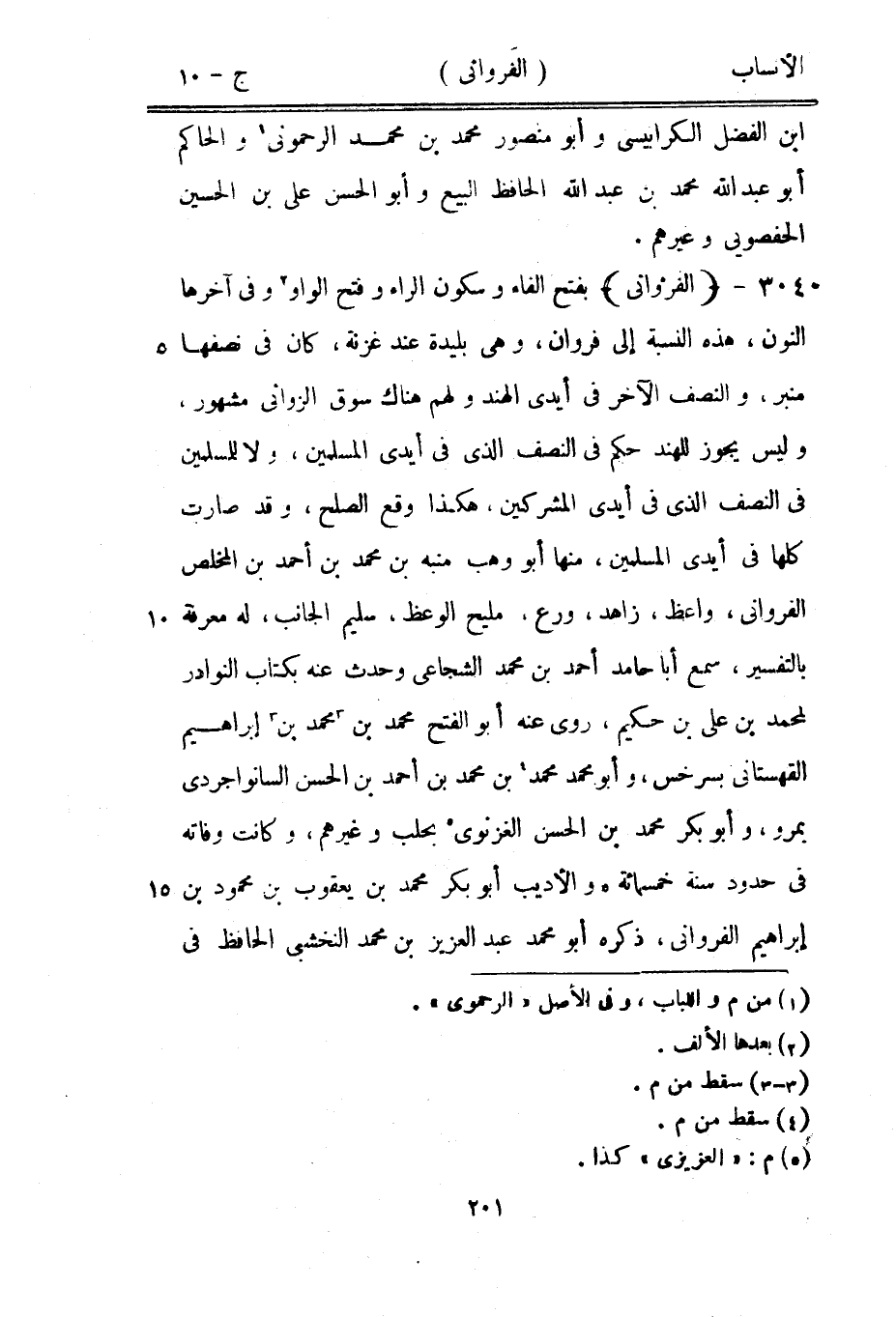 بفتح الفاء وسكون الراء وفتح الواو [2] وفي آخرها النون، هذه النسبة إلى فروان، وهي بليدة عند غزنة، كان في نصفها منبر، والنصف الآخر في أيدي الهند ولهم هناك سوق الزواني مشهور، وليس يجوز للهند حكم في النصف الّذي في أيدي المسلمين، ولا للمسلمين في النصف الّذي في أيدي المشركين، هكذا وقع الصلح، وقد صارت كلها في أيدي المسلمين، منها أبو وهب منبه بن محمد بن أحمد بن المخلص الفروانى، واعظ، زاهد، ورع، مليح الوعظ، سليم الجانب، له معرفة بالتفسير، سمع أبا حامد أحمد بن محمد الشجاعي وحدث عنه بكتاب النوادر لمحمد بن على بن حكيم، روى عنه أبو الفتح محمد بن [3] محمد بن [3] إبراهيم القهستاني بسرخس، وأبو محمد محمد [4] بن محمد بن أحمد بن الحسن السانواجردى بمرو، وأبو بكر محمد بن الحسن الغزنوي [5] بحلب وغيرهم، وكانت وفاته في حدود سنة خمسمائة والأديب أبو بكر محمد بن يعقوب بن محمود بن إبراهيم الفروانى، ذكره أبو محمد عبد العزيز بن محمد النخشبى الحافظ في