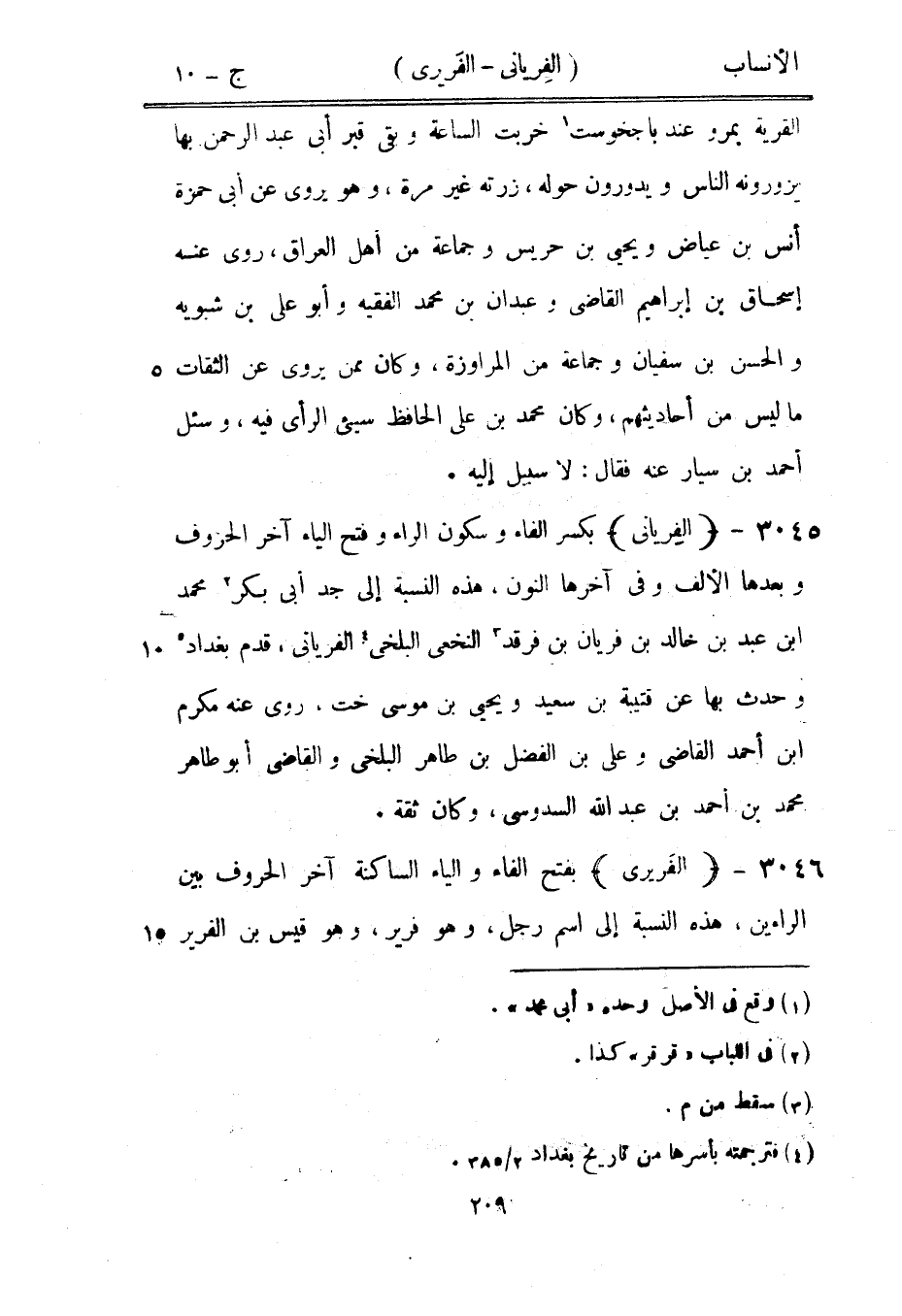 بكسر الفاء وسكون الراء وفتح الياء آخر الحروف وبعدها الألف وفي آخرها النون، هذه النسبة إلى جد أبى بكر [2] محمد ابن عبد بن خالد بن فريان بن فرقد [3] النخعي البلخي [4] الفرياني، قدم بغداد وحدث بها عن قتيبة بن سعيد ويحيى بن موسى خت، روى عنه مكرم ابن أحمد القاضي وعلى بن الفضل بن طاهر البلخي والقاضي أبو طاهر محمد بن أحمد بن عبد الله السدوسي، وكان ثقة.
