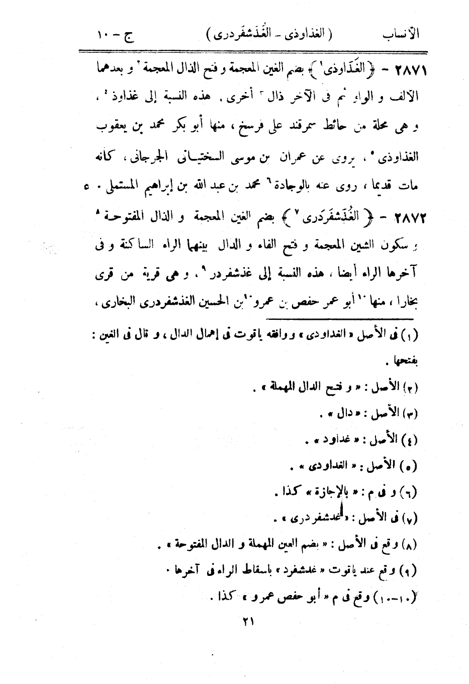 بضم الغين المعجمة والذال المفتوحة [8] وسكون الشين المعجمة وفتح الفاء والدال بينهما الراء الساكنة وفي آخرها الراء أيضا، هذه النسبة إلى غذشفردر [9] ، وهي قرية من قرى بخارا، منها [10] أبو عمر حفص بن عمرو [10] بن الحسين الغذشفردرى البخاري،