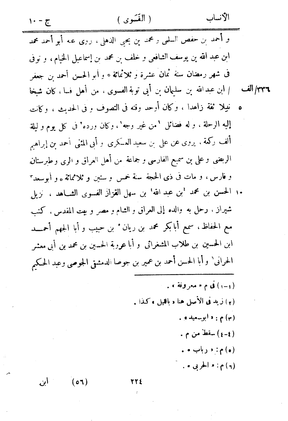 وأحمد بن حفص السلمي ومحمد بن يحيى الذهلي، روى عنه أبو أحمد محمد ابن عبد الله بن يوسف الشافعيّ وخلف بن محمد بن إسماعيل الخيام، وتوفى في شهر رمضان سنة ثمان عشرة وثلاثمائة وأبو الحسن أحمد بن جعفر/ ابن عبد الله بن سليمان بن أبى توبة الفسوي، من أهل فسا، كان شيخا نبيلا ثقة زاهدا، وكان أوحد وقته في التصوف وفي الحديث، وكانت إليه الرحلة، وله فضائل [1] من غير وجه [1] ، وكان ورده [2] في كل يوم وليلة ألف ركعة، يروى عن على بن سعيد العسكري وأبى المثنى أحمد بن إبراهيم الربضى وعلى بن سميع الفارسي وجماعة من أهل العراق والري وطبرستان وفارس، ومات في ذي الحجة سنة خمس وستين وثلاثمائة وأبو سعد [3] الحسن بن محمد [4] بن عبد الله [4] بن سهل القزاز الفسوي الشاهد، نزيل شيراز، رحل به والده إلى العراق والشام ومصر وبيت المقدس، كتب مع الحفاظ، سمع أبا بكر محمد بن ريان [5] بن حبيب وأبا الجهم أحمد ابن الحسين بن طلاب المشغرائي وأبا عروبة الحسين بن محمد بن أبى معشر الحراني [6] وأبا الحسن أحمد بن عمير بن جوصا الدمشقيّ الجوصى وعبد الحكيم