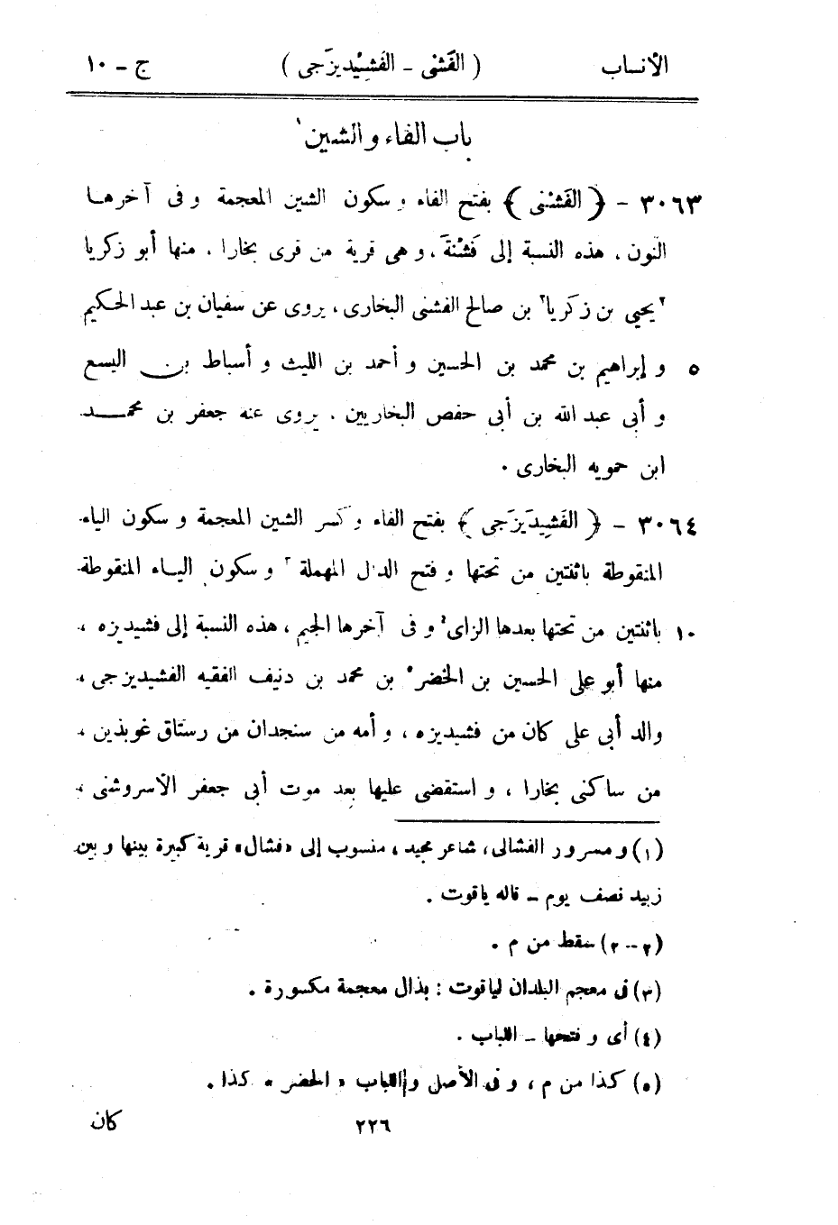 بفتح الفاء وكسر الشين المعجمة وسكون الياء المنقوطة باثنتين من تحتها وفتح الدال المهملة [3] وسكون الياء المنقوطة باثنتين من تحتها بعدها الزاى [4] وفي آخرها الجيم، هذه النسبة إلى فشيديزه، منها أبو على الحسين بن الخضر [5] بن محمد بن دنيف الفقيه الفشيديزجى، والد أبى على كان من فشيديزه، وأمه من سنجدان من رستاق غوبذين، من ساكني بخارا، واستقضى عليها بعد موت أبى جعفر الأسروشني،
