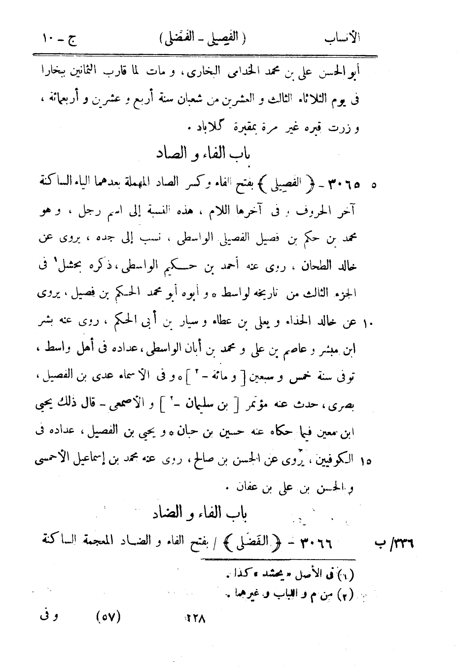بفتح الفاء وكسر الصاد المهملة بعدهما الياء الساكنة آخر الحروف وفي آخرها اللام، هذه النسبة إلى اسم رجل، وهو محمد بن حكم بن فصيل الفصيلى الواسطي، نسب إلى جده، يروى عن خالد الطحان، روى عنه أحمد بن حكيم الواسطي، ذكره بحشل [1] في الجزء الثالث من تاريخه لواسط وأبوه أبو محمد الحكم بن فصيل، يروى عن خالد الحذاء ويعلى بن عطاء وسيار بن أبى الحكم، روى عنه بشر ابن مبشر وعاصم بن على ومحمد بن أبان الواسطي، عداده في أهل واسط، توفى سنة خمس وسبعين [ومائة-[2]] وفي الأسماء عدي بن الفصيل، بصرى، حدث عنه مؤتمر [بن سليمان-[2]] والأصمعي- قال ذلك يحيى ابن معين فيما حكاه عنه حسين بن حبان ويحيى بن الفصيل، عداده في الكوفيين، يروى عن الحسن بن صالح، روى عنه محمد بن إسماعيل الأحمسي والحسن بن على بن عفان.