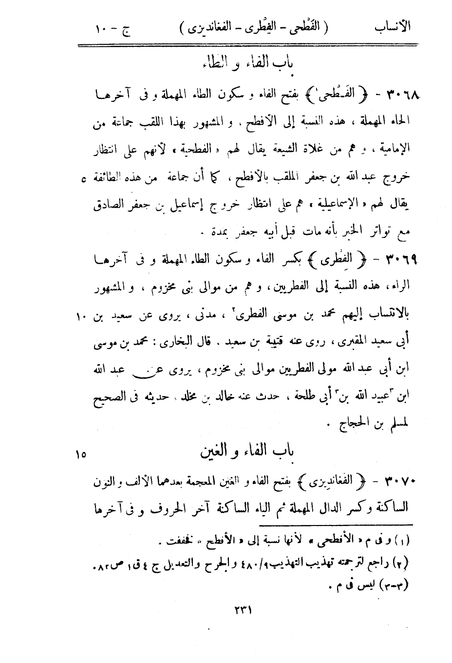 بكسر الفاء وسكون الطاء المهملة وفي آخرها الراء، هذه النسبة إلى الفطريين، وهم من موالي بنى مخزوم، والمشهور بالانتساب إليهم محمد بن موسى الفطري [2] ، مدني، يروى عن سعيد بن أبى سعيد المقبري، روى عنه قتيبة بن سعيد، قال البخاري: محمد بن موسى ابن أبى عبد الله مولى الفطريين موالي بنى مخزوم، يروى عن عبد الله ابن [3] عبيد الله بن [3] أبى طلحة، حدث عنه خالد بن مخلد، حديثه في الصحيح لمسلم بن الحجاج.