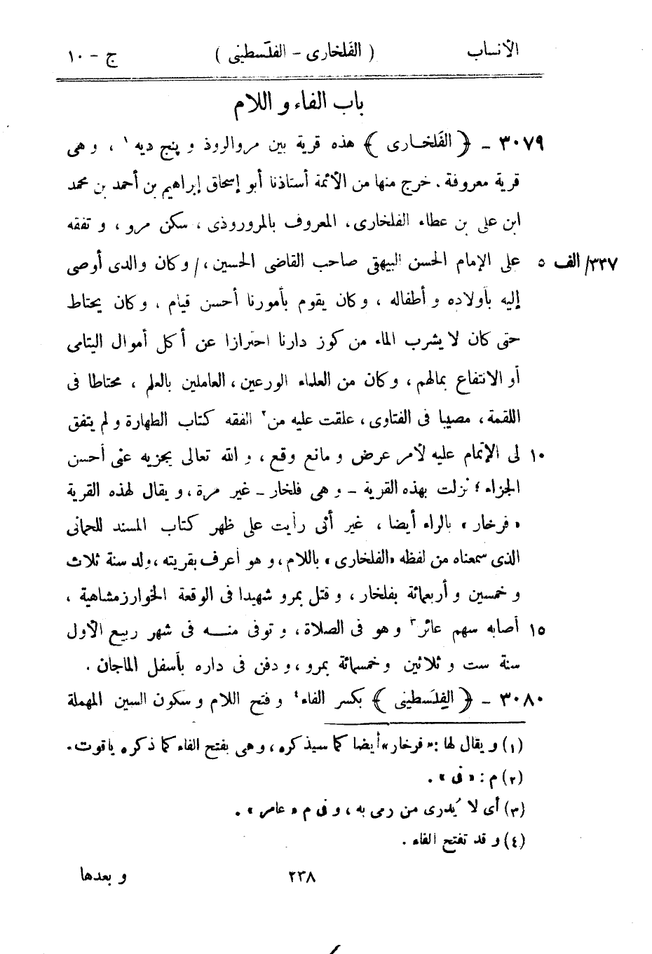 هذه قرية بين مروالروذ و پنج ديه [1] ، وهي قرية معروفة، خرج منها من الأئمة أستاذنا أبو إسحاق إبراهيم بن أحمد بن محمد ابن على بن عطاء الفلخارى، المعروف بالمروروذى، سكن مرو، وتفقه على الإمام الحسن البيهقي صاحب القاضي الحسين،/ وكان والدي أوصى إليه بأولاده وأطفاله، وكان يقوم بأمورنا أحسن قيام، وكان يحتاط حتى كان لا يشرب الماء من كوز دارنا احترازا عن أكل أموال اليتامى أو الانتفاع بمالهم، وكان من العلماء الورعين، العاملين بالعلم، محتاطا في اللقمة، مصيبا في الفتاوى، علقت عليه من [2] الفقه كتاب الطهارة ولم يتفق لي الإتمام عليه لأمر عرض ومانع وقع، والله تعالى يجزيه عنى أحسن الجزاء، نزلت بهذه القرية- وهي فلخار- غير مرة، ويقال لهذه القرية «فرخار» بالراء أيضا، غير أنى رأيت على ظهر كتاب المسند للحمانى الّذي سمعناه من لفظه «الفلخارى» باللام، وهو أعرف بقريته، ولد سنة ثلاث وخمسين وأربعمائة بفلخار، وقتل بمرو شهيدا في الوقعة الخوارزمشاهية، أصابه سهم عائر [3] وهو في الصلاة، وتوفى منه في شهر ربيع الأول سنة ست وثلاثين وخمسمائة بمرو، ودفن في داره بأسفل الماجان.