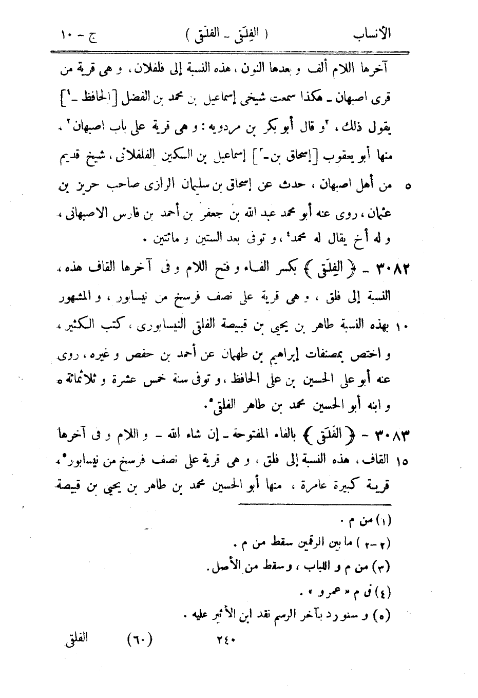 بالفاء المفتوحة- إن شاء الله- واللام وفي آخرها القاف، هذه النسبة إلى فلق، وهي قرية على نصف فرسخ من نيسابور [5] ، قرية كبيرة عامرة، منها أبو الحسين محمد بن طاهر بن يحيى بن قبيصة