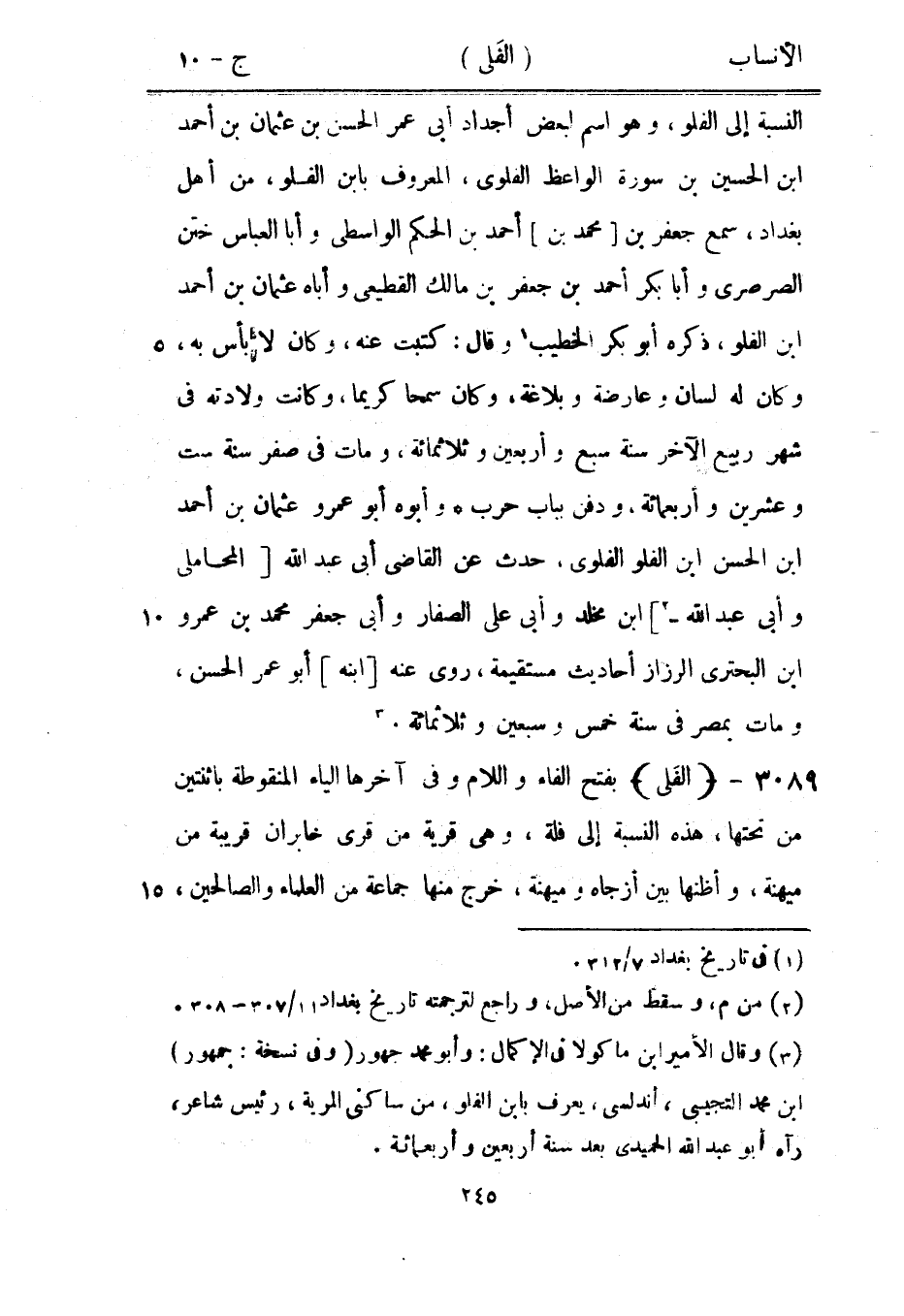 النسبة إلى الفلو، وهو اسم لبعض أجداد أبى عمر الحسن بن عثمان بن أحمد ابن الحسين بن سورة الواعظ الفلوى، المعروف بابن الفلو، من أهل بغداد، سمع جعفر بن [محمد بن] أحمد بن الحكم الواسطي وأبا العباس ختن الصرصرى وأبا بكر أحمد بن جعفر بن مالك القطيعي وأباه عثمان بن أحمد ابن الفلو، ذكره أبو بكر الخطيب [1] وقال: كتبت عنه، وكان لا بأس به، وكان له لسان وعارضة وبلاغة، وكان سمحا كريما، وكانت ولادته في شهر ربيع الآخر سنة سبع وأربعين وثلاثمائة، ومات في صفر سنة ست وعشرين وأربعمائة، ودفن بباب حرب وأبوه أبو عمرو عثمان بن أحمد ابن الحسن ابن الفلو الفلوى، حدث عن القاضي أبى عبد الله [المحاملي وأبى عبد الله-[2]] ابن مخلد وأبى على الصفار وأبى جعفر محمد بن عمرو ابن البحتري الرزاز أحاديث مستقيمة، روى عنه [ابنه] أبو عمر الحسن، ومات بمصر في سنة خمس وسبعين وثلاثمائة. [3]