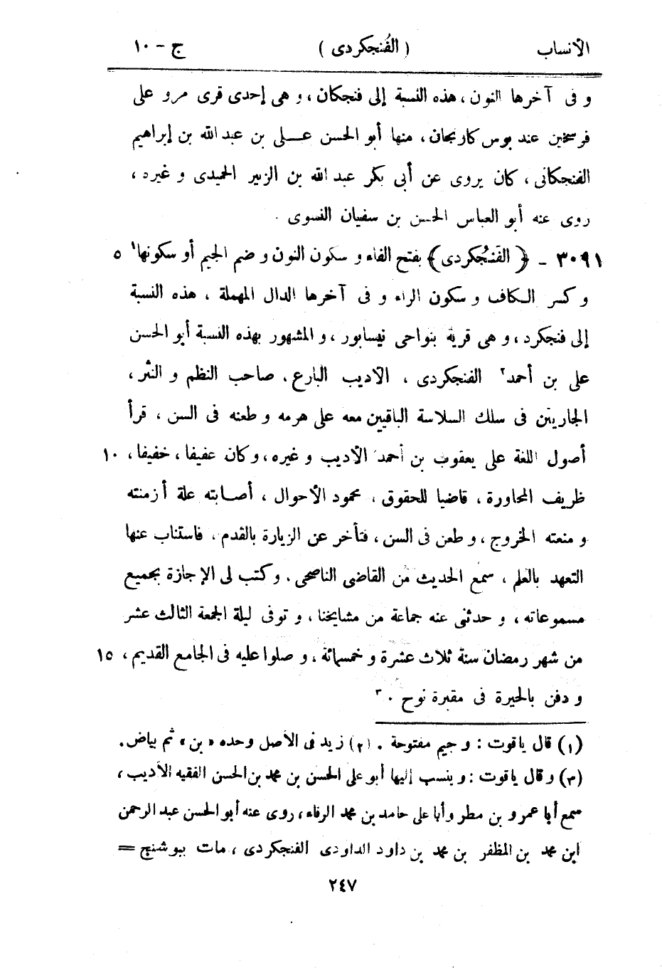 بفتح الفاء وسكون النون وضم الجيم أو سكونها [1] وكسر الكاف وسكون الراء وفي آخرها الدال المهملة، هذه النسبة إلى فنجكرد، وهي قرية بنواحي نيسابور، والمشهور بهذه النسبة أبو الحسن على بن أحمد [2] الفنجكردي، الأديب البارع، صاحب النظم والنثر، الجاريين في سلك السلاسة الباقيين معه على هرمه وطعنه في السن، قرأ أصول اللغة على يعقوب بن أحمد الأديب وغيره، وكان عفيفا، خفيفا، ظريف المحاورة، قاضيا للحقوق، محمود الأحوال، أصابته علة أزمنته ومنعته الخروج، وطعن في السن، فتأخر عن الزيارة بالقدم، فاستناب عنها التعهد بالعلم، سمع الحديث من القاضي الناصحى، وكتب لي الإجازة بجميع مسموعاته، وحدثني عنه جماعة من مشايخنا، وتوفى ليلة الجمعة الثالث عشر من شهر رمضان سنة ثلاث عشرة وخمسمائة، وصلوا عليه في الجامع القديم، ودفن بالحيرة في مقبرة نوح. [3]