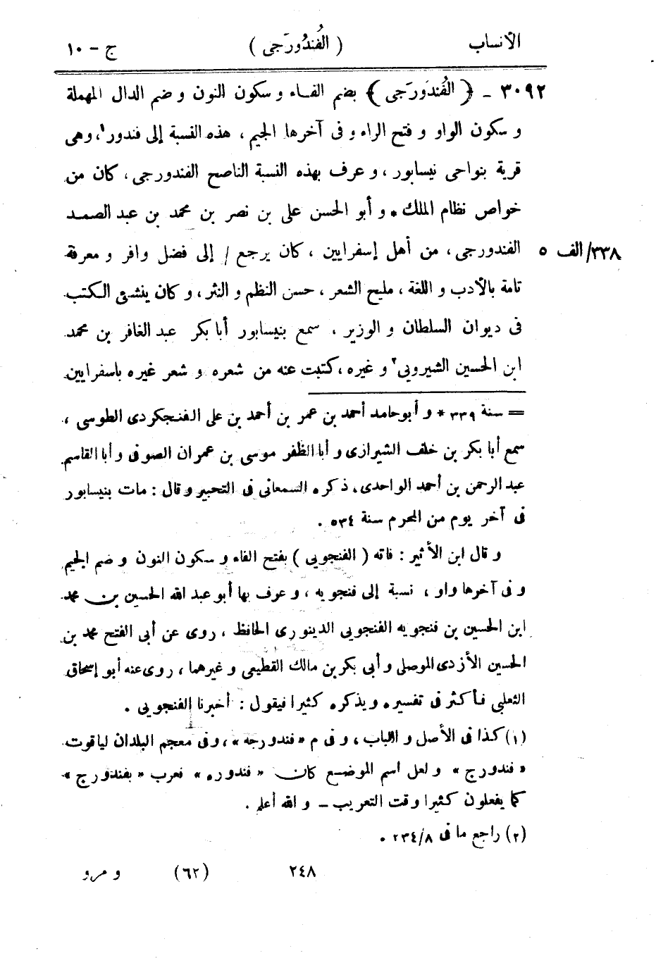 بضم الفاء وسكون النون وضم الدال المهملة وسكون الواو وفتح الراء وفي آخرها الجيم، هذه النسبة إلى فندور [1] ، وهي قرية بنواحي نيسابور، وعرف بهذه النسبة الناصح الفندورجى، كان من خواص نظام الملك وأبو الحسن على بن نصر بن محمد بن عبد الصمد الفندورجى، من أهل أسفرايين، كان يرجع/ إلى فضل وافر ومعرفة تامة بالأدب واللغة، مليح الشعر، حسن النظم والنثر، وكان ينشئ الكتب في ديوان السلطان والوزير، سمع بنيسابور أبا بكر عبد الغافر بن محمد ابن الحسين الشيرويى [2] وغيره، كتبت عنه من شعره وشعر غيره بأسفرايين