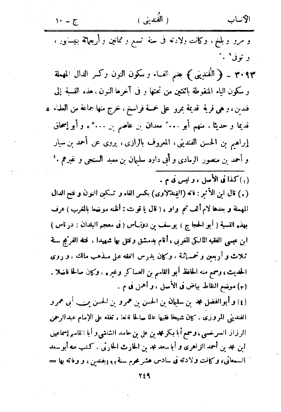 بضم الفاء وسكون النون وكسر الدال المهملة وسكون الياء المنقوطة باثنتين من تحتها وفي آخرها النون، هذه النسبة إلى فندين، وهي قرية قديمة بمرو على خمسة فراسخ، خرج منها جماعة من العلماء قديما وحديثا، منهم أبو ... [3] معدان بن عاصم بن ... [3] وأبو إسحاق إبراهيم بن الحسن الفندينى، المعروف بالرازي، يروى عن أحمد بن سيار وأحمد بن منصور الرمادي وأبى داود سليمان بن معبد السنجى وغيرهم. [4]