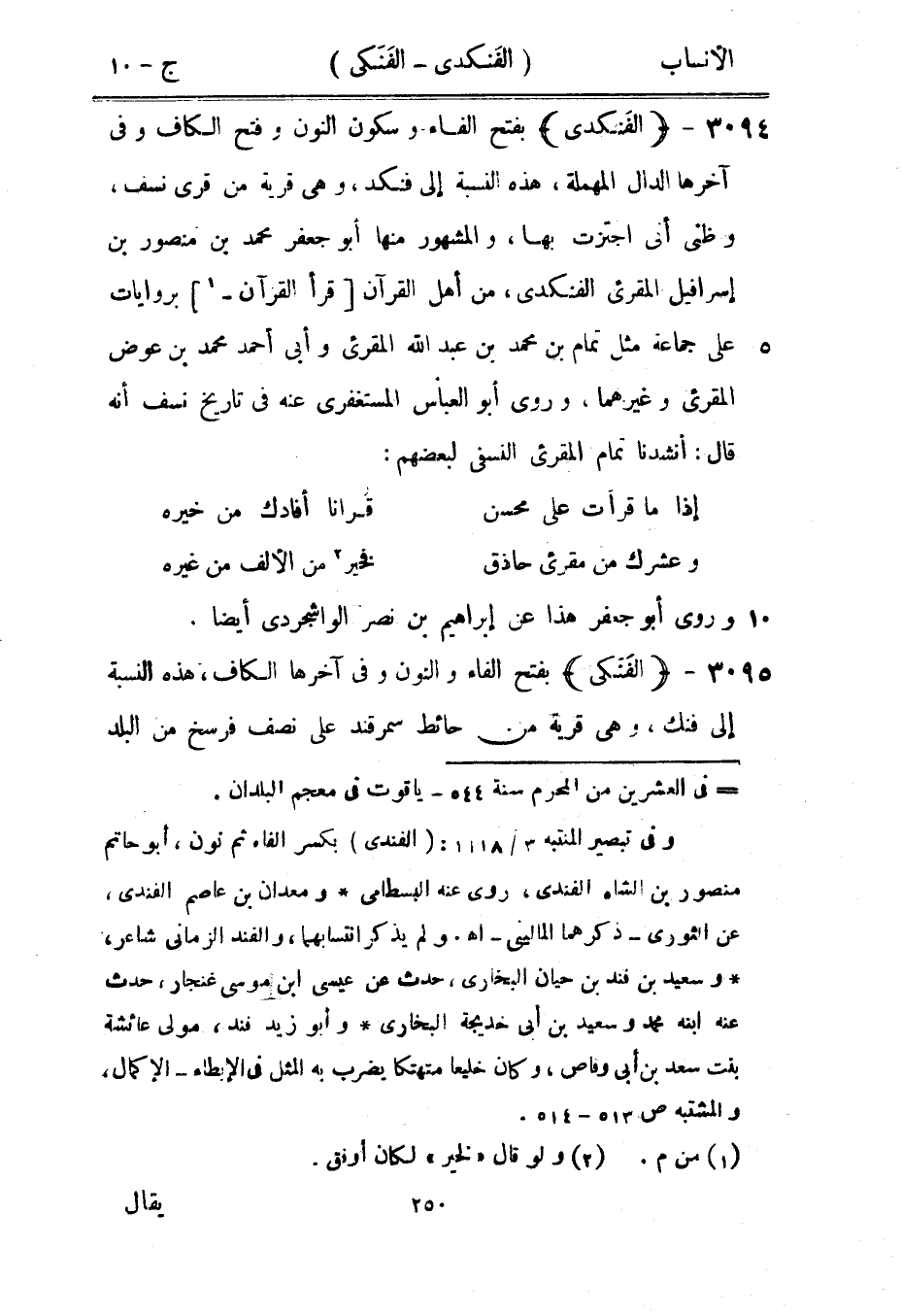 بفتح الفاء وسكون النون وفتح الكاف وفي آخرها الدال المهملة، هذه النسبة إلى فنكد، وهي قرية من قرى نسف، وظني أنى اجتزت بها، والمشهور منها أبو جعفر محمد بن منصور بن إسرافيل المقرئ الفنكدى، من أهل القرآن [قرأ القرآن-[1]] بروايات على جماعة مثل تمام بن محمد بن عبد الله المقرئ وأبى أحمد محمد بن عوض المقرئ وغيرهما، وروى أبو العباس المستغفري عنه في تاريخ نسف أنه قال: أنشدنا تمام المقرئ النسفي لبعضهم: