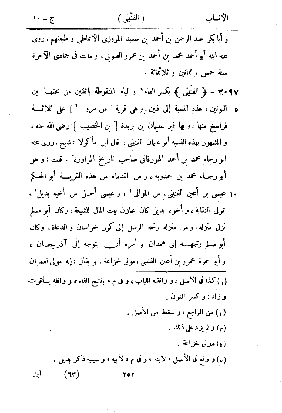 بكسر الفاء [1] والياء المنقوطة باثنتين من تحتها بين النونين، هذه النسبة إلى فنين، وهي قرية [من مرو-[2]] على ثلاثة فراسخ منها، وبها قبر سليمان بن بريدة [بن الخصيب] رضى الله عنه، والمشهور بهذه النسبة أبو عثمان الفنينى، قال ابن ماكولا: شيخ، روى عنه ابو رجاء محمد بن أحمد الهورقانى صاحب تاريخ المراوزة [3] . قلت: وهو أبو رجاء محمد بن حمدويه ومن القدماء من هذه القرية أبو الحكم عيسى بن أعين الفنينى، من الموالي [4] ، وعيسى أجل من أخيه بديل [5] ، تولى النقابة وأخوه بديل كان خازن بيت المال للشيعة، وكان أبو مسلم نزل منزله، ومن منزله وجّه الرسل إلى كور خراسان والدعاة، وكان أبو مسلم وجّهه إلى همذان وأمره أن يتوجه إلى آذربيجان وأبو حمزة عمرو بن أعين الفنينى، مولى خزاعة، ويقال: إنه مولى لعمران