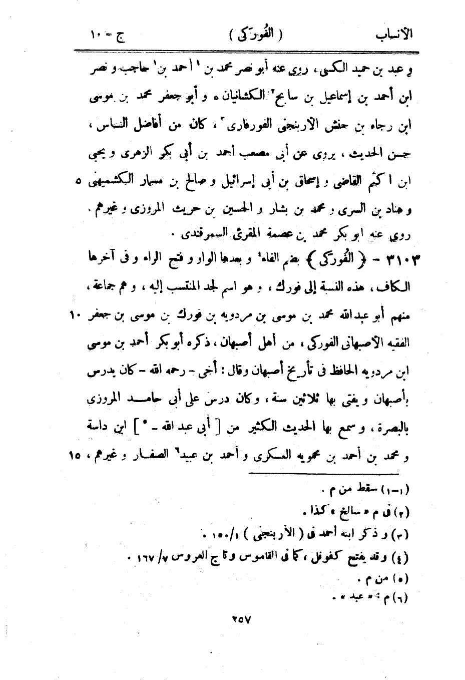بضم الفاء [4] وبعدها الواو وفتح الراء وفي آخرها الكاف، هذه النسبة إلى فورك، وهو اسم لجد المنتسب إليه، وهم جماعة، منهم أبو عبد الله محمد بن موسى بن مردويه بن فورك بن موسى بن جعفر الفقيه الأصبهاني الفوركى، من أهل أصبهان، ذكره أبو بكر أحمد بن موسى ابن مردويه الحافظ في تأريخ أصبهان وقال: أخى- رحمه الله- كان يدرس بأصبهان ويفتى بها ثلاثين سنة، وكان درس على أبى حامد المروزي بالبصرة، وسمع بها الحديث الكثير من [أبى عبد الله-[5]] ابن داسة ومحمد بن أحمد بن محمويه العسكري وأحمد بن عبيد [6] الصفار وغيرهم،