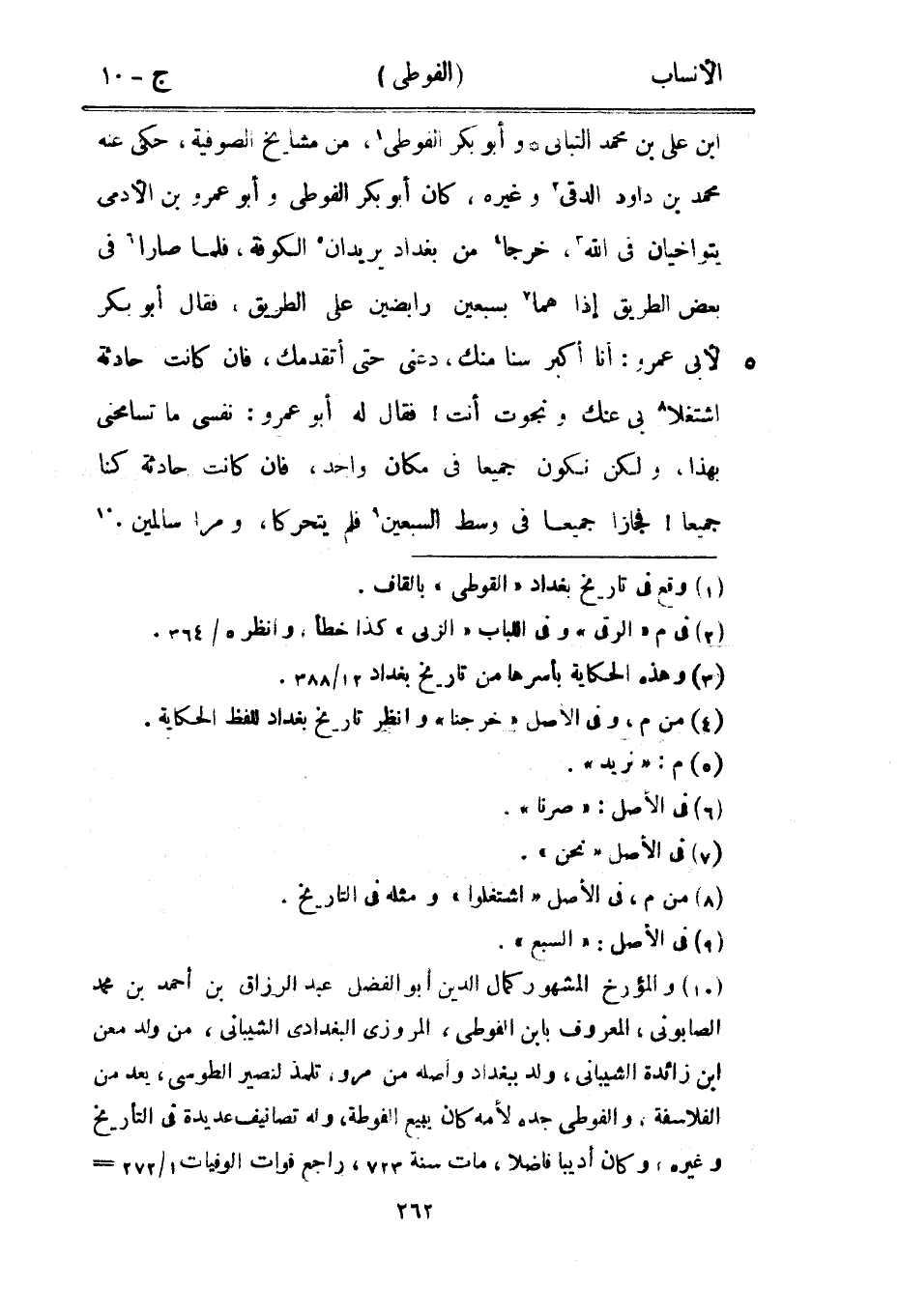 [10] والمؤرخ المشهور كمال الدين أبو الفضل عبد الرزاق بن أحمد بن محمد الصابوني، المعروف بابن الفوطي، المروزي البغدادي الشيباني، من ولد معن ابن زائدة الشيباني، ولد ببغداد وأصله من مرو، تلمذ لنصير الطوسي، يعد من الفلاسفة، والفوطي جده لأمه كان يبيع الفوطة، وله تصانيف عديدة في التأريخ وغيره، وكان أديبا فاضلا، مات سنة 723، راجع فوات الوفيات 1/ 272