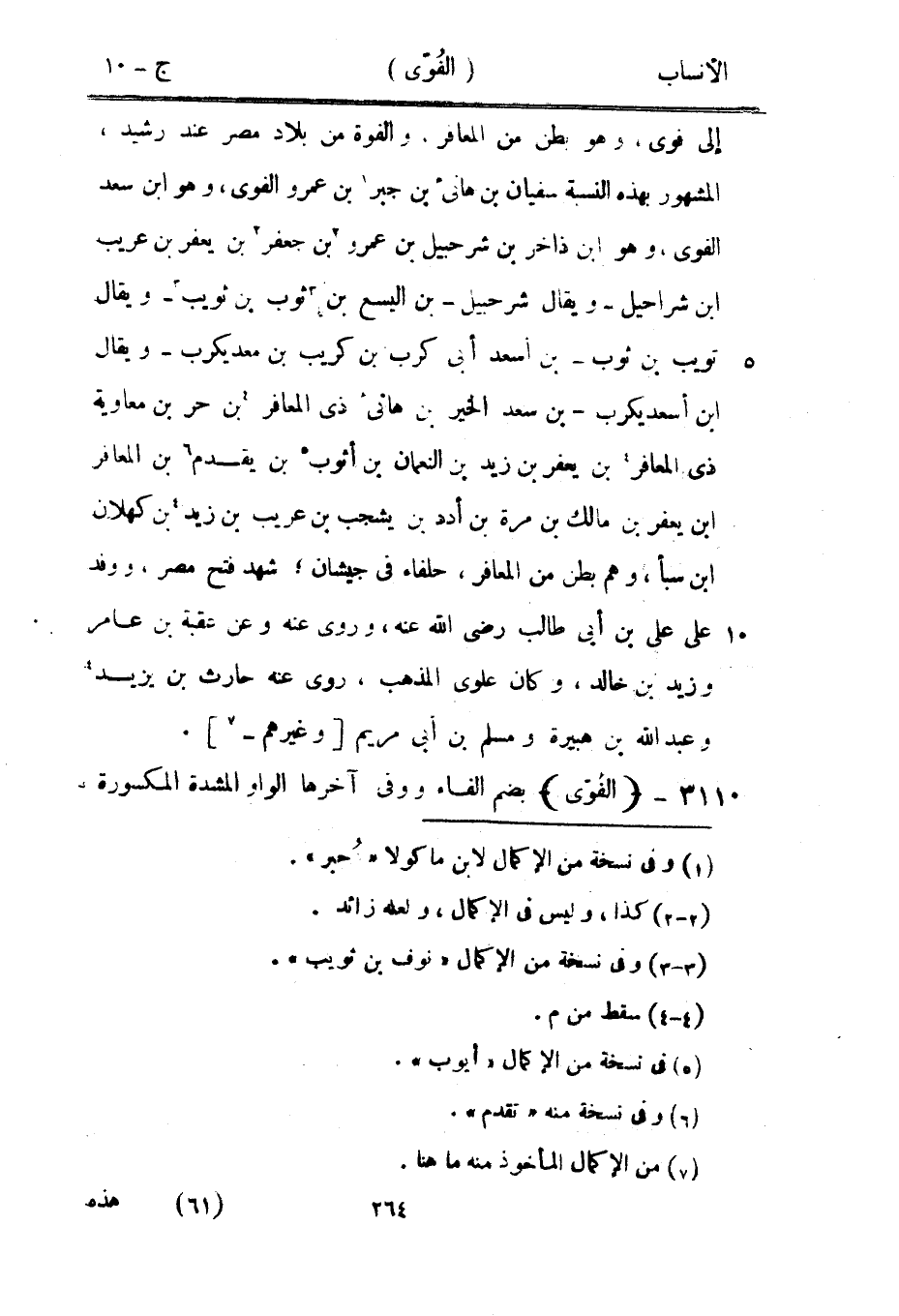 إلى فوا، وهو بطن من المعافر، والفوة من بلاد مصر عند رشيد، المشهور بهذه النسبة سفيان بن هانئ بن جبر [1] بن عمرو الفوى، وهو ابن سعد الفوى، وهو ابن ذاخر بن شرحبيل بن عمرو [2] بن جعفر [2] بن يعفر بن عريب ابن شراحيل- ويقال شرحبيل- بن اليسع بن [3] ثوب بن ثويب [3]- ويقال ثويب بن ثوب- بن أسعد أبى كرب بن كريب بن معديكرب- ويقال ابن أسعد معديكرب- بن سعد الخير بن هانئ ذي المعافر [4] بن حر بن معاوية ذي المعافر [4] بن يعفر بن زيد بن النعمان بن أثوب [5] بن يقدم [6] بن المعافر ابن يعفر بن مالك بن مرة بن أدد بن يشجب بن عريب بن زيد [4] بن كهلان ابن سبإ، وهم بطن من المعافر، حلفاء في جيشان، شهد فتح مصر، ووفد على على بن أبى طالب رضى الله عنه، وروى عنه وعن عقبة بن عامر وزيد بن خالد، وكان علوي المذهب، روى عنه حارث بن يزيد [4] وعبد الله بن هبيرة ومسلم بن أبى مريم [وغيرهم-[7]] .