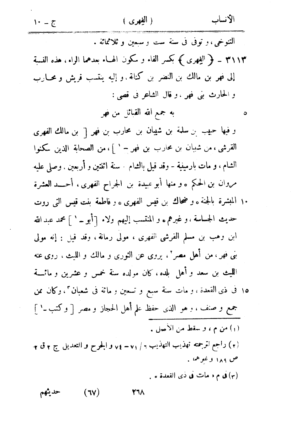 وفيها حبيب بن سلمة بن شيبان بن محارب بن فهر [بن مالك الفهري القرشي، من شيبان بن محارب بن فهر-[1]] ، من الصحابة الذين سكنوا الشام، ومات بارمينية- وقد قيل بالشام- سنة اثنتين وأربعين، وصلى عليه مروان بن الحكم ومنها أبو عبيدة بن الجراح الفهري، أحد العشرة المبشرة بالجنة وضحاك بن قيس الفهري وفاطمة بنت قيس التي روت حديث الجساسة، وغيرهم والمنتسب إليهم ولاء [أبو-[1]] محمد عبد الله ابن وهب بن مسلم القرشي الفهري، مولى رمانة، وقد قيل: إنه مولى بنى فهر، من أهل مصر [2] ، يروى عن الثوري ومالك والليث، روى عنه الليث بن سعد وأهل بلده، كان مولده سنة خمس وعشرين ومائة في ذي القعدة، ومات سنة سبع وتسعين ومائة في شعبان [3] ، وكان ممن جمع وصنف، وهو الّذي حفظ علم أهل الحجاز ومصر [وكتب-[1]]