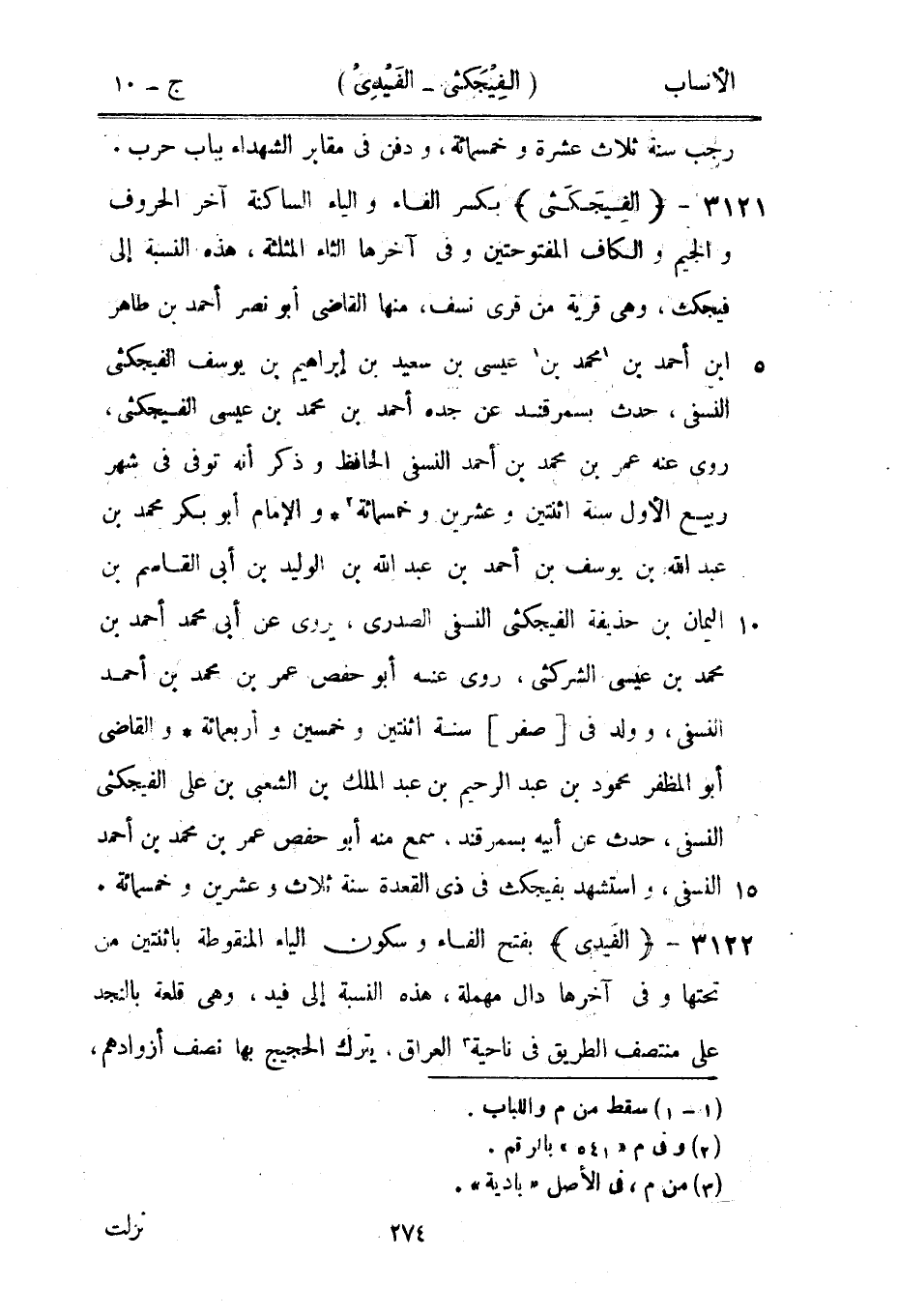 بكسر الفاء والياء الساكنة آخر الحروف والجيم والكاف المفتوحتين وفي آخرها الثاء المثلثة، هذه النسبة إلى فيجكث، وهي قرية من قرى نسف، منها القاضي أبو نصر أحمد بن طاهر ابن أحمد بن [1] محمد بن [1] عيسى بن سعيد بن إبراهيم بن يوسف الفيجكثى النسفي، حدث بسمرقند عن جده أحمد بن محمد بن عيسى الفيجكثى، روى عنه عمر بن محمد بن أحمد النسفي الحافظ وذكر أنه توفى في شهر ربيع الأول سنة اثنتين وعشرين وخمسمائة [2] والإمام أبو بكر محمد بن عبد الله بن يوسف بن أحمد بن عبد الله بن الوليد بن أبى القاسم بن اليمان بن حذيفة الفيجكثى النسفي الصدرى، يروى عن أبى محمد أحمد بن محمد بن عيسى الشركثى، روى عنه أبو حفص عمر بن محمد بن أحمد النسفي، وولد في [صفر] سنة اثنتين وخمسين وأربعمائة والقاضي أبو المظفر محمود بن عبد الرحيم بن عبد الملك بن الشعبي بن على الفيجكثى النسفي، حدث عن أبيه بسمرقند، سمع منه أبو حفص عمر بن محمد بن أحمد النسفي، واستشهد بفيجكث في ذي القعدة سنة ثلاث وعشرين وخمسمائة.