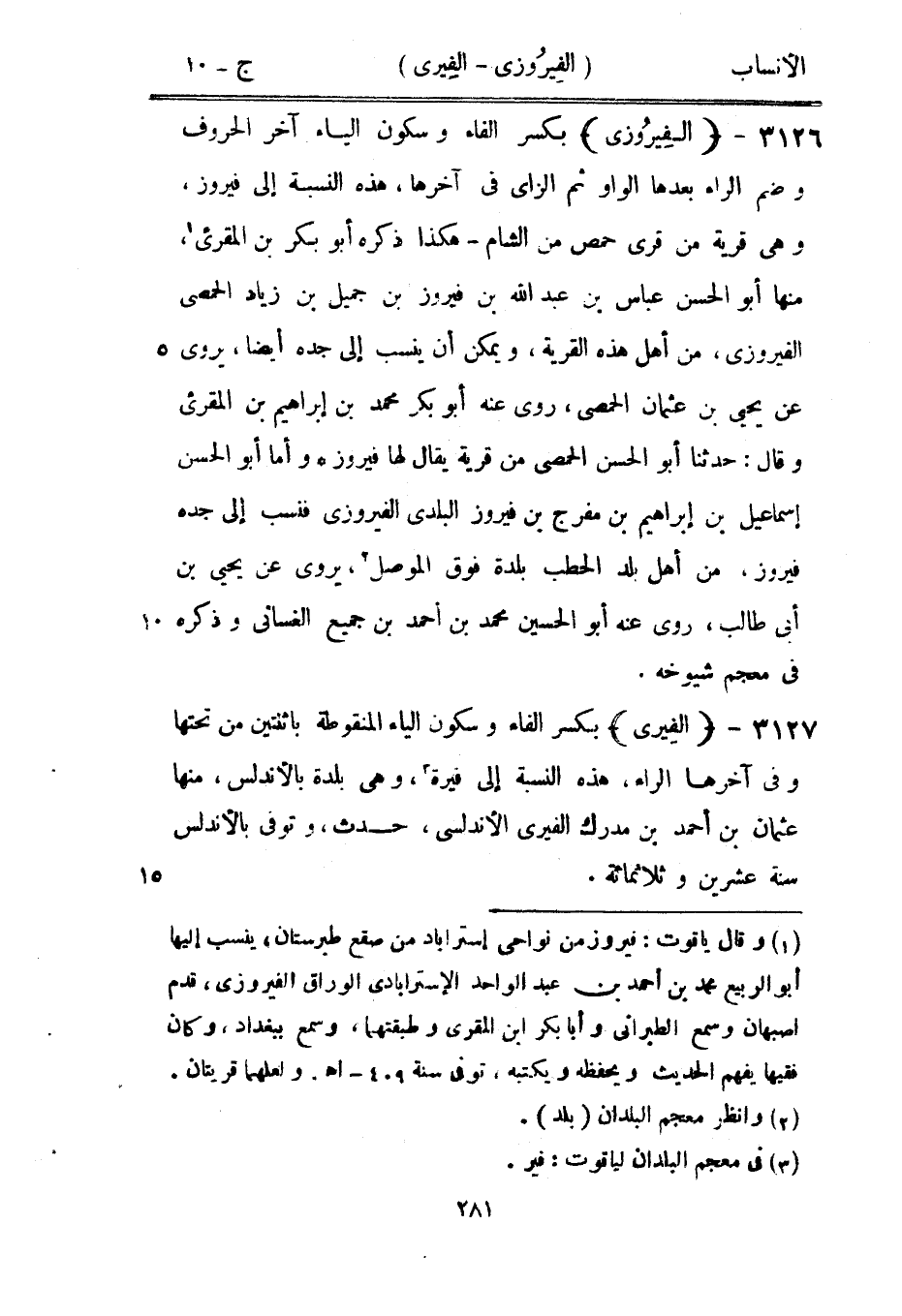 بكسر الفاء وسكون الياء آخر الحروف وضم الراء بعدها الواو ثم الزاى في آخرها، هذه النسبة إلى فيروز، وهي قرية من قرى حمص من الشام- هكذا ذكره أبو بكر بن المقرئ [1] ، منها أبو الحسن عباس بن عبد الله بن فيروز بن جميل بن زياد الحمصي الفيروزى، من أهل هذه القرية، ويمكن أن ينسب إلى جده أيضا، يروى عن يحيى بن عثمان الحمصي، روى عنه أبو بكر محمد بن إبراهيم بن المقرئ وقال: حدثنا أبو الحسن الحمصي من قرية يقال لها فيروز وأما أبو الحسن إسماعيل بن إبراهيم بن مفرج بن فيروز البلدي الفيروزى فنسب إلى جده فيروز، من أهل بلد الحطب بلدة فوق الموصل [2] ، يروى عن يحيى بن أبى طالب، روى عنه أبو الحسين محمد بن أحمد بن جميع الغساني وذكره في معجم شيوخه.