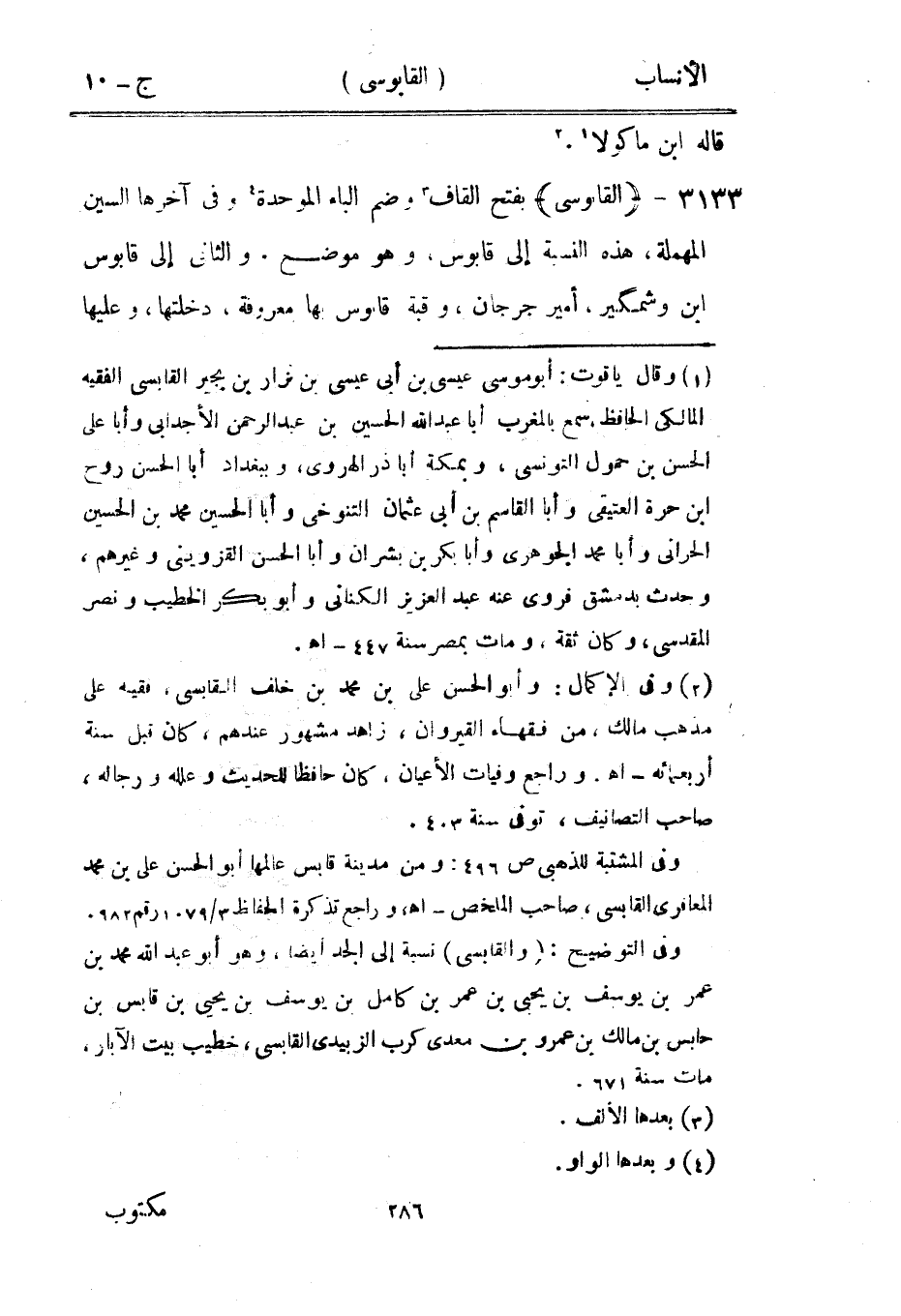 بفتح القاف [3] وضم الباء الموحدة [4] وفي آخرها السين المهملة، هذه النسبة إلى قابوس، وهو موضع. والثاني إلى قابوس ابن وشمكير، أمير جرجان، وقبة قابوس بها معروفة، دخلتها، وعليها
