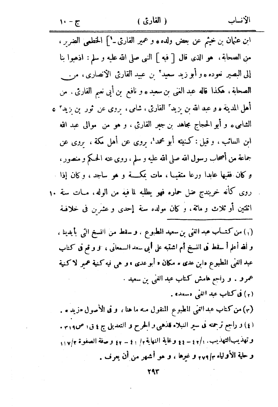 ابن عثمان بن خيثم عن بعض ولده وعمير القارئ-[1]] الخطميّ الضرير، من الصحابة، هو الّذي قال [فيه] النبي صلى الله عليه وسلم: اذهبوا بنا إلى البصير نعوده وأبو زيد سعيد [2] بن عبيد القارئ الأنصاري، من الصحابة، هكذا قاله عبد الغنى بن سعيد ونافع بن أبى نعيم القارئ، من أهل المدينة وعبد الله بن يزيد [3] القارئ، شامي، يروى عن ثور بن يزيد [3] الشامي وأبو الحجاج مجاهد بن جبر القارئ، وهو من موالي عبد الله ابن السائب، وقيل: كنيته أبو محمد [4] ، يروى عن أهل مكة، يروى عن جماعة من أصحاب رسول الله صلى الله عليه وسلم، روى عنه الحكم ومنصور، وكان فقيها عابدا ورعا متقيا، مات بمكة وهو ساجد، وكان إذا روى كأنه خربندج ضل حماره فهو يطلبه لما فيه من الوله، مات سنة اثنتين أو ثلاث ومائة، وكان مولده سنة إحدى وعشرين في خلافة