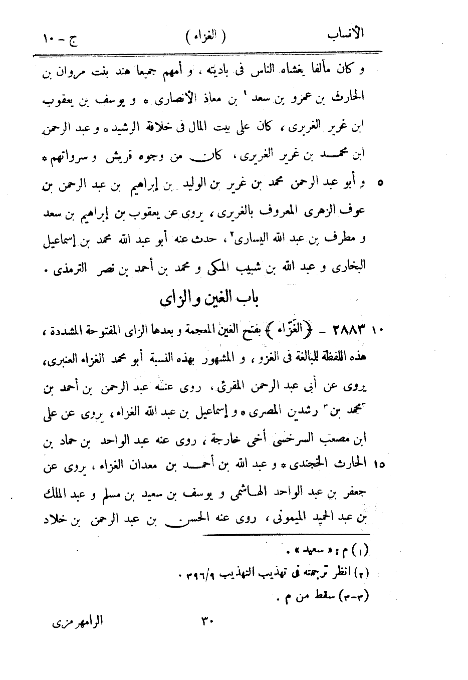 بفتح الغين المعجمة وبعدها الزاى المفتوحة المشددة، هذه اللفظة للمبالغة في الغزو، والمشهور بهذه النسبة أبو محمد الغزاء العنبري، يروى عن أبى عبد الرحمن المقرئ، روى عنه عبد الرحمن بن أحمد بن [3] محمد بن [3] رشدين المصري وإسماعيل بن عبد الله الغزاء، يروى عن على ابن مصعب السرخسي أخى خارجة، روى عنه عبد الواحد بن حماد بن الحارث الخجنديّ وعبد الله بن أحمد بن معدان الغزاء، يروى عن جعفر بن عبد الواحد الهاشمي ويوسف بن سعيد بن مسلم وعبد الملك بن عبد الحميد الميموني، روى عنه الحسن بن عبد الرحمن بن خلاد