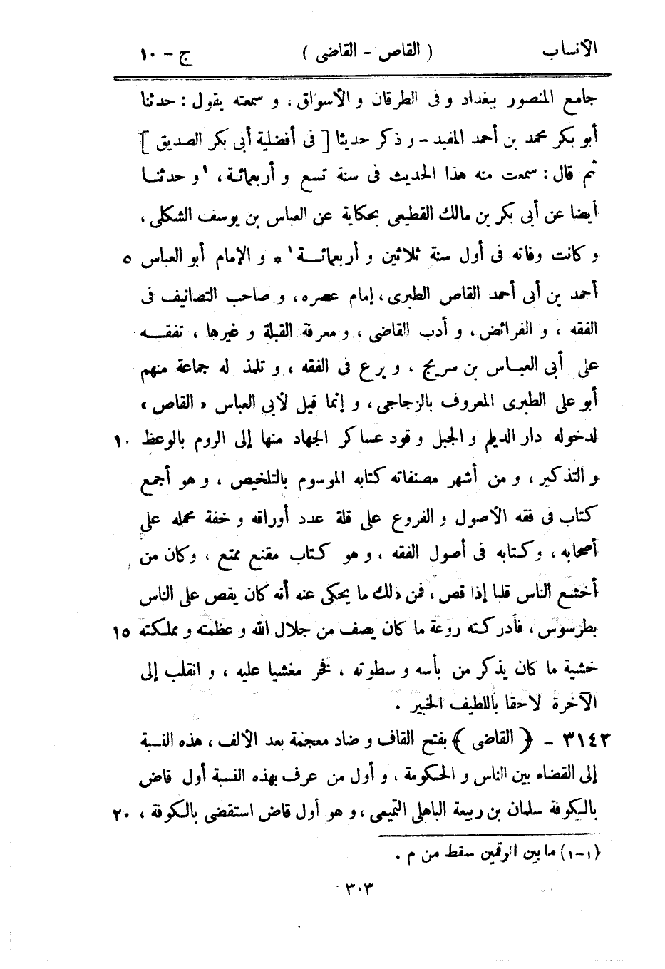 جامع المنصور ببغداد وفي الطرقان والأسواق، وسمعته يقول: حدثنا أبو بكر محمد بن أحمد المفيد- وذكر حديثا [في أفضلية أبى بكر الصديق] ثم قال: سمعت منه هذا الحديث في سنة تسع وأربعمائة، [1] وحدثنا أيضا عن أبى بكر بن مالك القطيعي بحكاية عن العباس بن يوسف الشكلى، وكانت وفاته في أول سنة ثلاثين وأربعمائة [1] والإمام أبو العباس أحمد بن أبى أحمد القاص الطبري، إمام عصره، وصاحب التصانيف في الفقه، والفرائض، وأدب القاضي، ومعرفة القبلة وغيرها، تفقه على أبى العباس بن سريج، وبرع في الفقه، وتلمذ له جماعة منهم أبو على الطبري المعروف بالزجاجى، وإنما قيل لأبى العباس «القاص» لدخوله دار الديلم والجبل وقود عساكر الجهاد منها إلى الروم بالوعظ والتذكير، ومن أشهر مصنفاته كتابه الموسوم بالتلخيص، وهو أجمع كتاب في فقه الأصول والفروع على قلة عدد أوراقه وخفة محمله على أصحابه، وكتابه في أصول الفقه، وهو كتاب مقنع ممتع، وكان من أخشع الناس قلبا إذا قص، فمن ذلك ما يحكى عنه أنه كان يقص على الناس بطرسوس، فأدركته روعة ما كان يصف من جلال الله وعظمته ومملكته خشية ما كان يذكر من بأسه وسطوته، فخر مغشيا عليه، وانقلب إلى الآخرة لاحقا باللطيف الخبير.