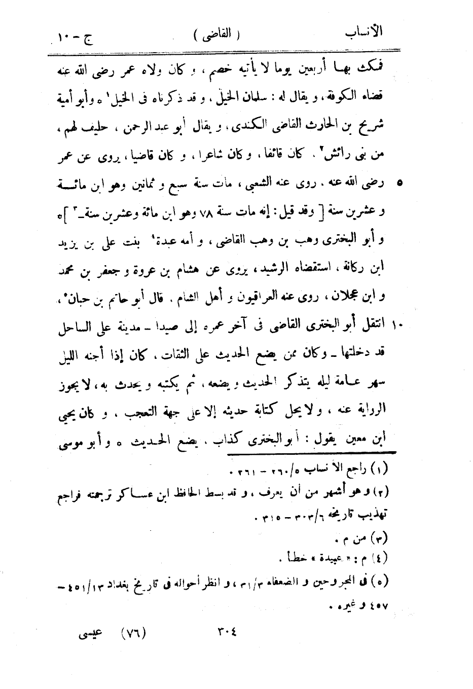 فمكث بها أربعين يوما لا يأتيه خصم، وكان ولاه عمر رضى الله عنه قضاء الكوفة، ويقال له: سلمان الخيل، وقد ذكرناه في الخيل [1] وأبو أمية شريح بن الحارث القاضي الكندي، ويقال أبو عبد الرحمن، حليف لهم، من بنى رائش [2] ، كان قائفا، وكان شاعرا، وكان قاضيا، يروى عن عمر رضى الله عنه، روى عنه الشعبي، مات سنة سبع وثمانين وهو ابن مائة وعشرين سنة [وقد قيل: إنه مات سنة 78 وهو ابن مائة وعشرين سنة-[3]] وأبو البختري وهب بن وهب القاضي، وأمه عبدة [4] بنت على بن يزيد ابن ركانة، استقضاه الرشيد، يروى عن هشام بن عروة وجعفر بن محمد وابن عجلان، روى عنه العراقيون وأهل الشام، قال أبو حاتم بن حبان [5] ، انتقل أبو البختري القاضي في آخر عمره إلى صيدا- مدينة على الساحل قد دخلتها- وكان ممن يضع الحديث على الثقات، كان إذا أجنه الليل سهر عامة ليله يتذكر الحديث ويضعه، ثم يكتبه ويحدث به، لا يجوز الرواية عنه، ولا يحل كتابة حديثه إلا على جهة التعجب، وكان يحيى ابن معين يقول: أبو البختري كذاب، يضع الحديث وأبو موسى