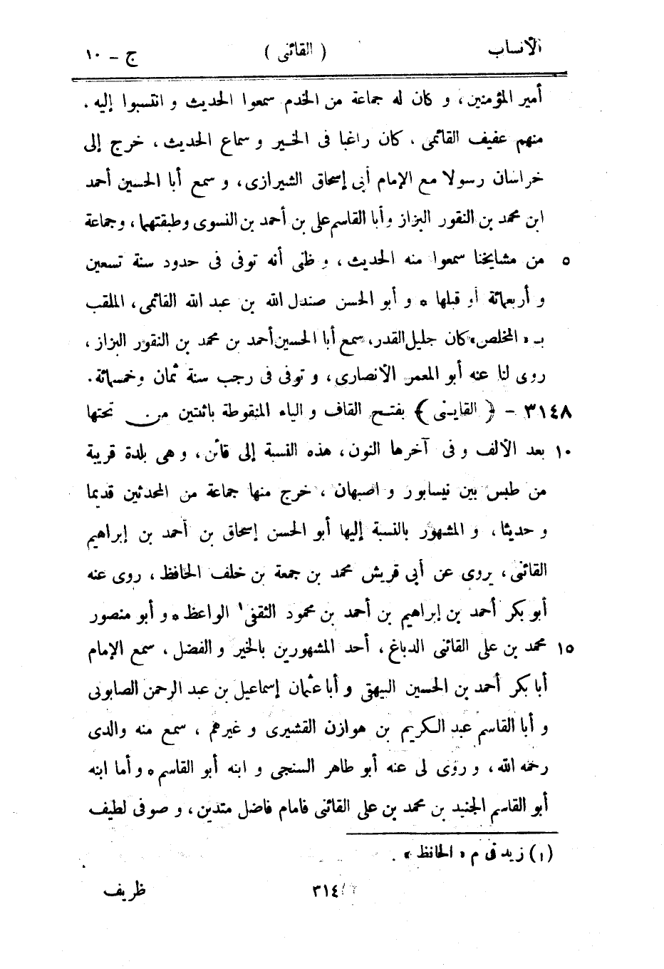 بفتح القاف والياء المنقوطة باثنتين من تحتها بعد الألف وفي آخرها النون، هذه النسبة إلى قائن، وهي بلدة قريبة من طبس بين نيسابور وأصبهان، خرج منها جماعة من المحدثين قديما وحديثا، والمشهور بالنسبة إليها أبو الحسن إسحاق بن أحمد بن إبراهيم القائنى، يروى عن أبى قريش محمد بن جمعة بن خلف الحافظ، روى عنه أبو بكر أحمد بن إبراهيم بن أحمد بن محمود الثقفي [1] الواعظ وأبو منصور محمد بن على القائنى الدباغ، أحد المشهورين بالخير والفضل، سمع الإمام أبا بكر أحمد بن الحسين البيهقي وأبا عثمان إسماعيل بن عبد الرحمن الصابوني وأبا القاسم عبد الكريم بن هوازن القشيري وغيرهم، سمع منه والدي رحمه الله، وروى لي عنه أبو طاهر السنجى وابنه أبو القاسم وأما ابنه أبو القاسم الجنيد بن محمد بن على القائنى فامام فاضل متدين، وصوفى لطيف