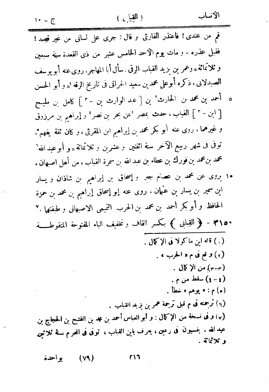 قم من عندي! فاعتذر القارئ وقال: جرى على لساني من غير قصد! فقبل عذره. ومات يوم الأحد الخامس عشر من ذي القعدة سنة سبعين وثلاثمائة وعمر بن يزيد القباب الرقى، سأل أبا المهاجر، روى عنه أبو يوسف الصيدلاني، ذكره أبو على محمد بن سعيد الحراني في تاريخ الرقة [1] وأبو الحسن أحمد بن محمد بن الحارث [2] بن [عبد الوارث بن-[3]] كامل بن مليح [ابن-[3]] القباب، حدث بمصر [4] عن بحر بن نصر [4] وإبراهيم بن مرزوق وغيرهما، روى عنه أبو بكر محمد بن إبراهيم ابن المقرئ، وكان ثقة يفهم [5] ، توفى في شهر ربيع الآخر سنة اثنتين وعشرين وثلاثمائة وأبو عبد الله [6] محمد بن محمد بن فورك بن عطاء بن عبد الله بن سمرة القباب، من أهل أصبهان، يروى عن محمد بن عصام جبر وإسحاق بن إبراهيم بن شاذان ويسار ابن سمير بن يسار بن عثمان، روى عنه أبو إسحاق إبراهيم بن محمد بن حمزة الحافظ وأبو بكر أحمد بن محمد بن الحرب التميمي الأصبهاني وطبقتهما. [7]