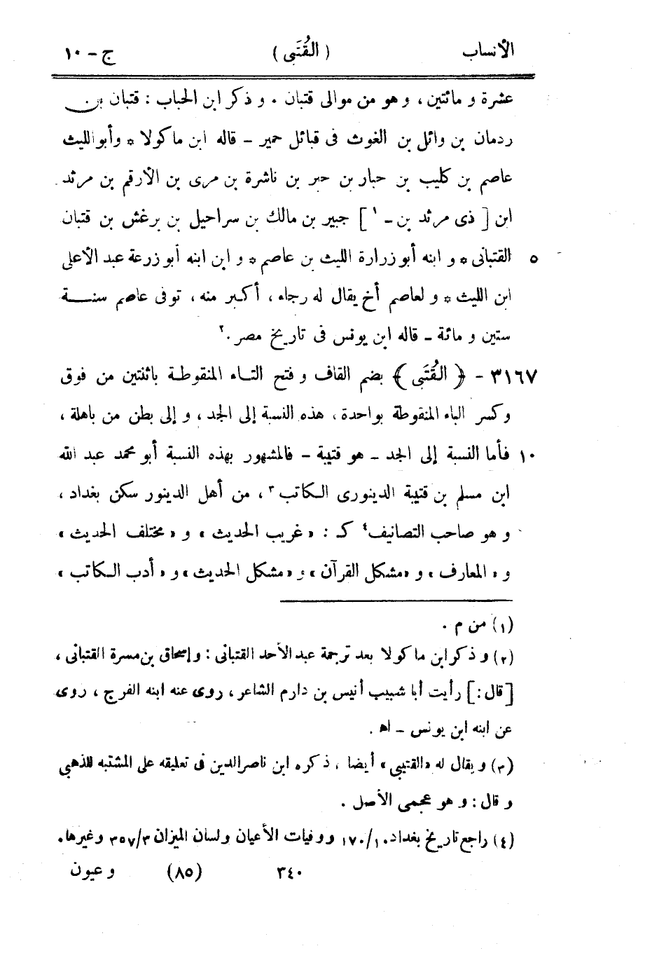 بضم القاف وفتح التاء المنقوطة باثنتين من فوق وكسر الباء المنقوطة بواحدة، هذه النسبة إلى الجد، وإلى بطن من باهلة، فأما النسبة إلى الجد- هو قتيبة- فالمشهور بهذه النسبة أبو محمد عبد الله ابن مسلم بن قتيبة الدينَوَريّ الكاتب [3] ، من أهل الدينور سكن بغداد، وهو صاحب التصانيف [4] ك: غريب الحديث» و «مختلف الحديث» و «المعارف» و «مشكل القرآن» و «مشكل الحديث» و «أدب الكاتب»