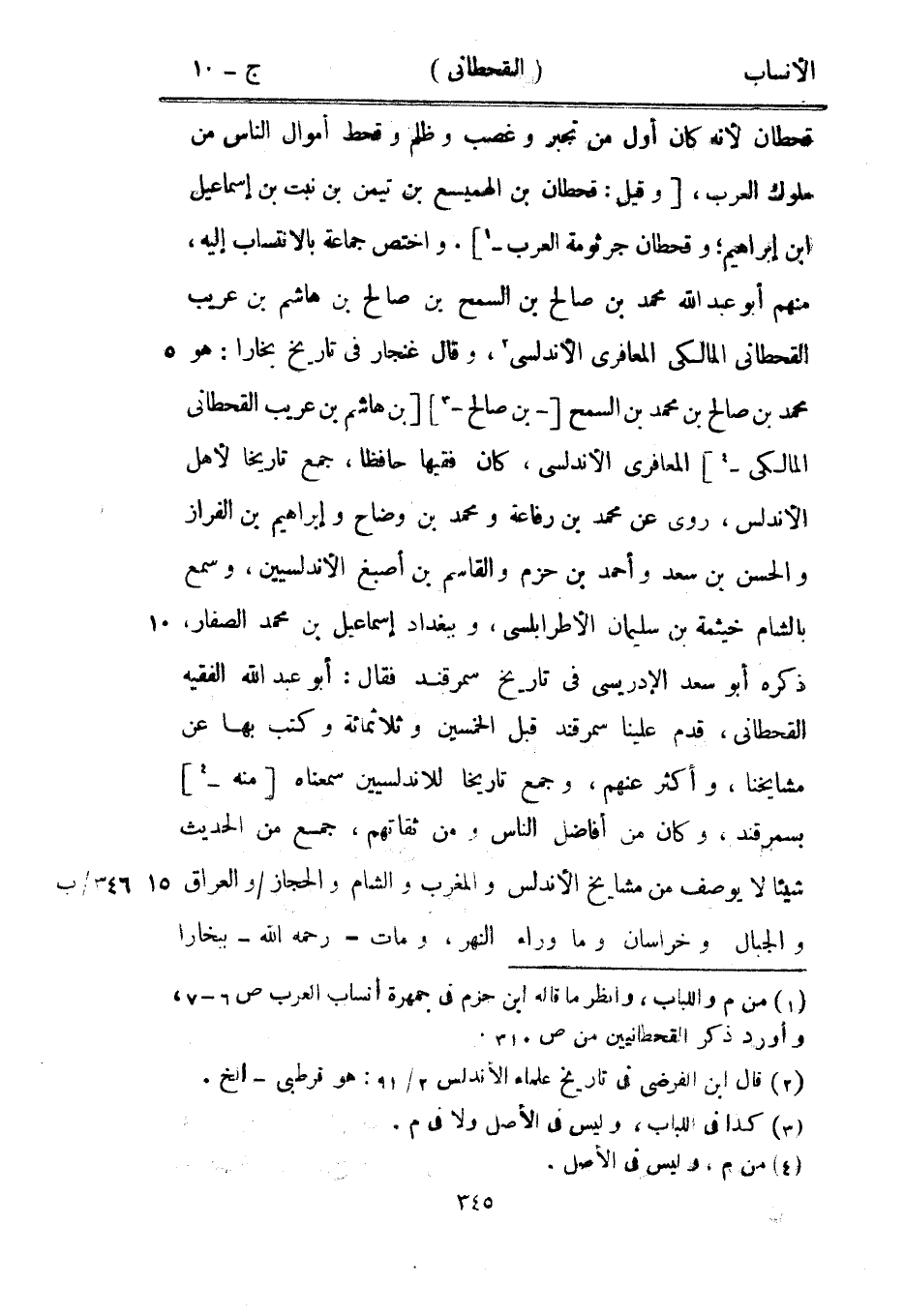 قحطان لأنه كان أول من تجبر وغصب وظلم وقحط أموال الناس من ملوك العرب، [وقيل: قحطان بن الهميسع بن تيمن بن نبت بن إسماعيل ابن إبراهيم، وقحطان جرثومة العرب-[1]] ، واختص جماعة بالانتساب إليه، منهم أبو عبد الله محمد بن صالح بن السمح بن صالح بن هاشم بن عريب القحطانى المالكي المعافري الأندلسى [2] ، وقال غنجار في تاريخ بخارا: هو محمد بن صالح بن محمد بن السمح [- بن صالح-[3]] [بن هاشم بن عريب القحطانى المالكي-[4]] المعافري الأندلسى، كان فقيها حافظا، جمع تاريخ لأهل الأندلس، روى عن محمد بن رفاعة ومحمد بن وضاح وإبراهيم بن الفراز والحسن بن سعد وأحمد بن حزم والقاسم بن أصبغ الأندلسيين، وسمع بالشام خيثمة بن سليمان الأطرابلسي، وببغداد إسماعيل بن محمد الصفار، ذكره أبو سعد الإدريسي في تاريخ سمرقند فقال: أبو عبد الله الفقيه القحطانى، قدم علينا سمرقند قبل الخمسين وثلاثمائة وكتب بها عن مشايخنا، وأكثر عنهم، وجمع تاريخا للاندلسيين سمعناه [منه-[4]] بسمرقند، وكان من أفاضل الناس ومن ثقاتهم، جمع من الحديث شيئا لا يوصف من مشايخ الأندلس والمغرب والشام والحجاز/ والعراق والجبال وخراسان وما وراء النهر، ومات- رحمه الله- ببخارا