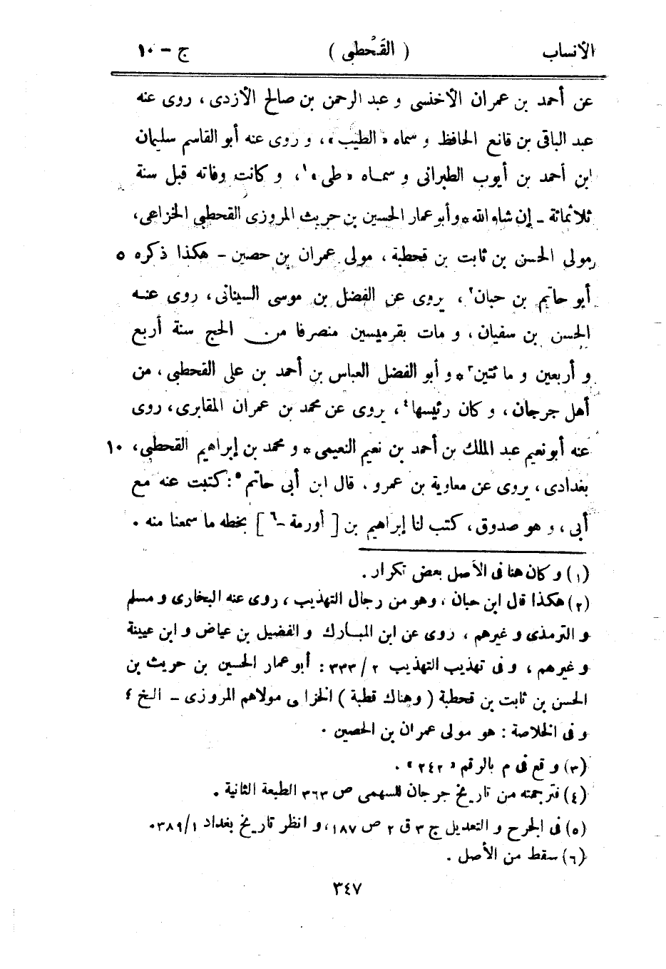 عن أحمد بن عمران الأخنسي وعبد الرحمن بن صالح الأزدي، روى عنه عبد الباقي بن قانع الحافظ وسماه «الطيب» ، وروى عنه أبو القاسم سليمان ابن أحمد بن أيوب الطبراني وسماه «طى» [1] ، وكانت وفاته قبل سنة ثلاثمائة- إن شاء الله وأبو عمار الحسين بن حريث المروزي القحطبي الخزاعي، مولى الحسن بن ثابت بن قحطبة، مولى عمران بن حصين- هكذا ذكره أبو حاتم بن حبان [2] ، يروى عن الفضل بن موسى السينانى، روى عنه الحسن بن سفيان، ومات بقرميسين منصرفا من الحج سنة أربع وأربعين ومائتين [3] وأبو الفضل العباس بن أحمد بن على القحطبي، من أهل جرجان، وكان رئيسها [4] ، يروى عن محمد بن عمران المقابري، روى عنه أبو نعيم عبد الملك بن أحمد بن نعيم النعيمي ومحمد بن إبراهيم القحطبي، بغدادي، يروى عن معاوية بن عمرو، قال ابن أبى حاتم [5] : كتبت عنه مع أبى، وهو صدوق، كتب لنا إبراهيم بن [أورمة-[6]] بخطه ما سمعنا منه.